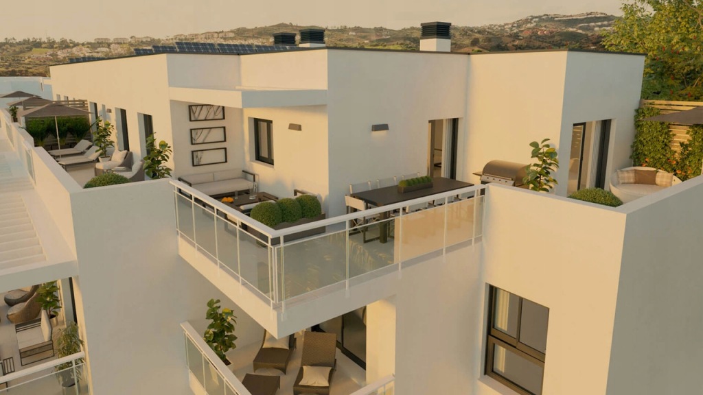 W apartamentach z 2 sypialniami wszystkie pomieszczenia mają dostęp do tarasu, a mieszkania na parterze dodatkowo posiadają prywatny ogród. Narożne apartamenty 3-sypialniane również oferują piękne tarasy, natomiast te na parterze mają imponujące ogrody okalające. Penthouse’y z 3 sypialniami dysponują ogromnym tarasem o powierzchni 80 m², idealnym do korzystania z uroków słońca Costa del Sol.