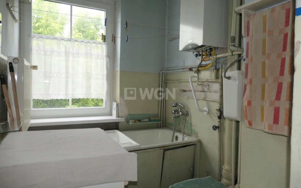 Po wejściu do mieszkania znajdujemy się w przedpokoju. Następnie kierując się na lewo przechodzimy do pierwszego pokoju i łazienki. Łazienka wyposażona została w wannę, kompakt WC, grzejnik oraz piec gazowy. Idąc dalej korytarzem mijamy kuchnię, w której znajdują się meble, kuchenka oraz zlewozmywak. Tuż obok mieści się drugi pokój.
