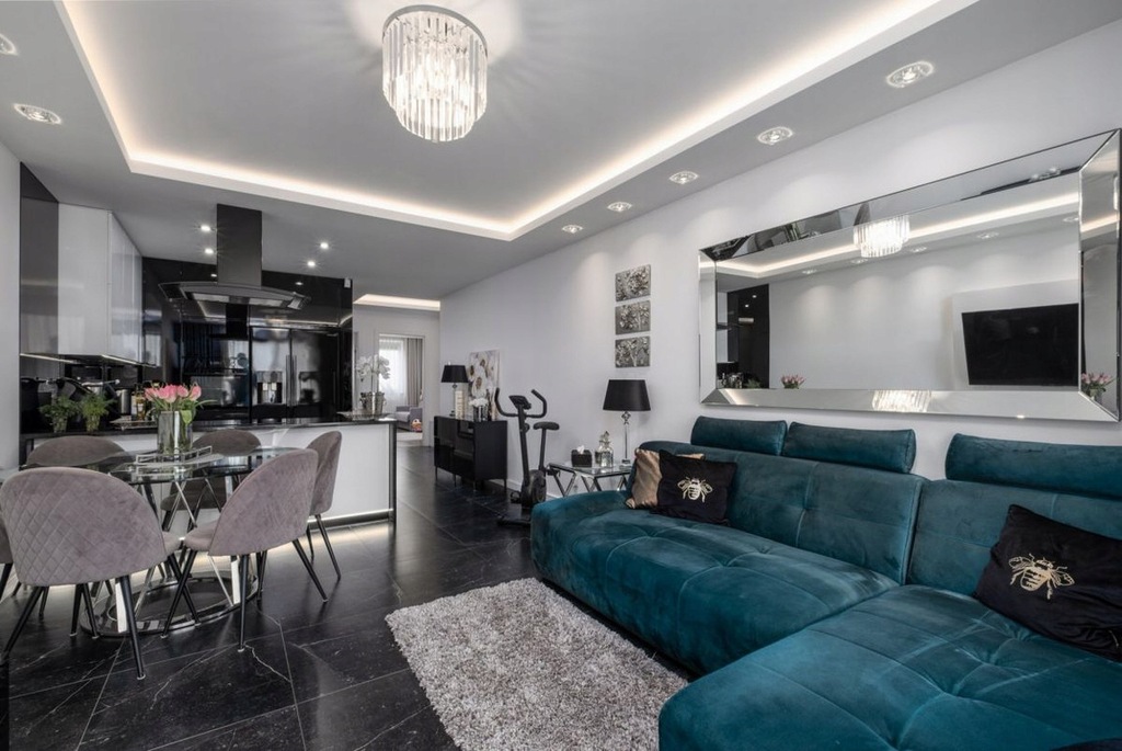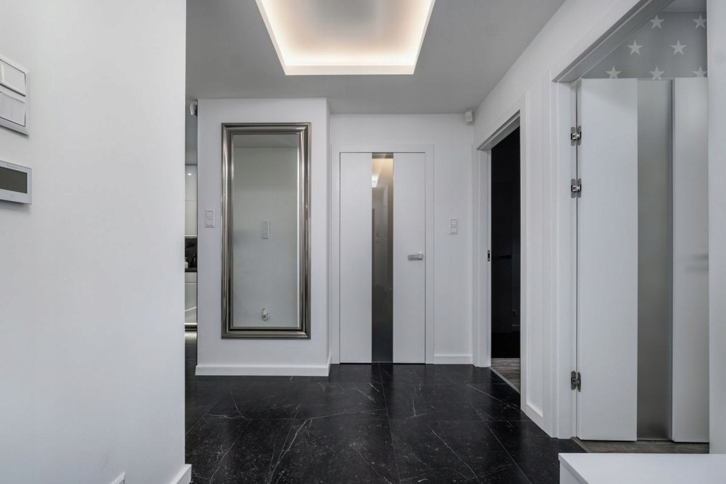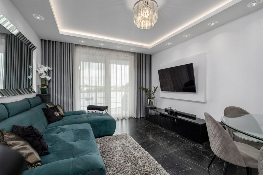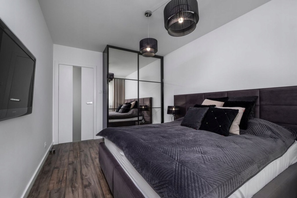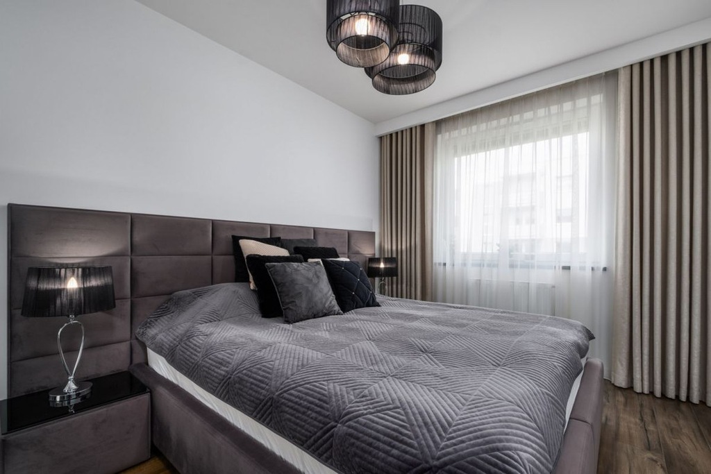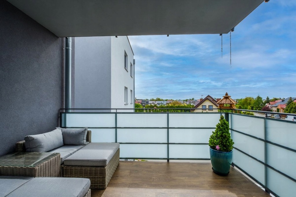 Przestronna nieruchomość z dużymi oknami zapewniającymi odpowiednie nasłonecznienie. Apartament został kompleksowo wykończony z użyciem wysokiej klasy materiałów. Salon w mieszkaniu jest przestronny i ustawny, znajduje się w nim miejsce na zestaw wypoczynkowy, duży telewizor a także funkcjonalnie oddzieloną część kuchenną ze stołem jadalnianym dla całej rodziny. Aneks kuchenny wyposażony jest w wysokiej klasy sprzęt AGD, z nowoczesną wyspą z granitu dającą możliwość wspólnego wypicia porannej kawy. Kuchnia wyposażona jest w sprzęt AGD taki jak: lodówka, zmywarka, piekarnik, okap, płyta ceramiczna oraz chłodziarka do wina. Z salonu wychodzimy na duży zagospodarowany i oświetlony balkon, w sam raz na spotkania ze znajomymi. W mieszkaniu na podłodze znajduje się wysokogatunkowy gres oraz wytrzymałe i dobrej klasy panele podłogowe. Sypialnia to komfortowa przestrzeń gwarantująca pełen wypoczynek. Na wyposażeniu pokoi oraz w korytarzu znajdują się duże pojemne szafy pod zabudowę. Łazienka została nowocześnie wykończona przy użyciu eleganckich kafli, wyposażona jest w kompaktową wannę, duże podgrzewane lustro powiększające optycznie wnętrze, matę podłogową ze sterownikiem temperatury oraz dobrej jakości ceramikę i armaturę podtynkową. Wystrój uzupełniają pojemne meble łazienkowe na kosmetyki i inne drobiazgi oraz zabudowa ze schowaną pralką. Dodatkowo w mieszkaniu znajduje się wielofunkcyjne pomieszczenie gospodarcze. Całe mieszkanie posiada nowoczesne ledowe oświetlenie i opuszczone sufity. W nieruchomości zamontowany jest system alarmowy wraz z czujnikami ruchu.