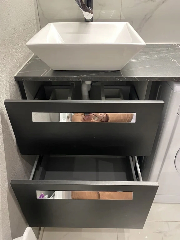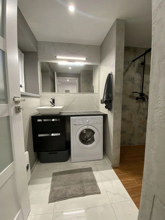 Kuchnia jest kompletnie wyposażona i umeblowana meble pod wymiar lodówko zamrażalka, piekarnik elektryczny, kuchenka indukcyjna, wyciąg, zmywarka, w łazience pralka.