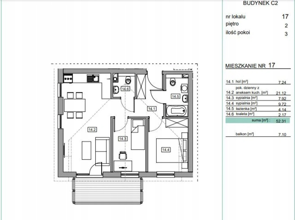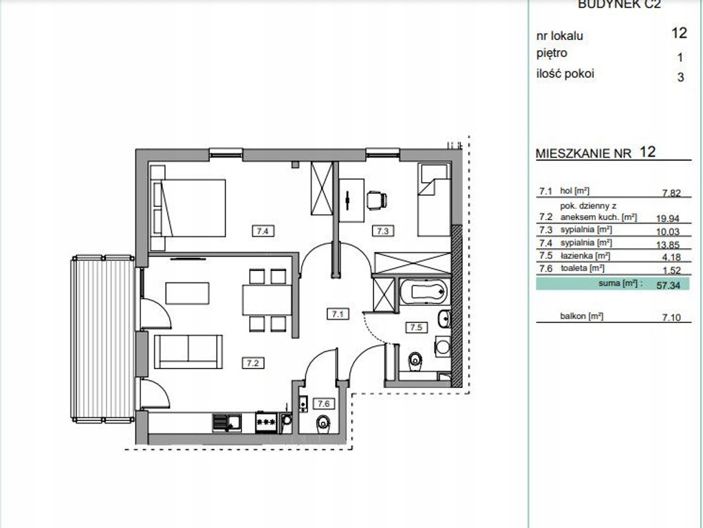 - Powierzchnia użytkowa: 57.34 m²