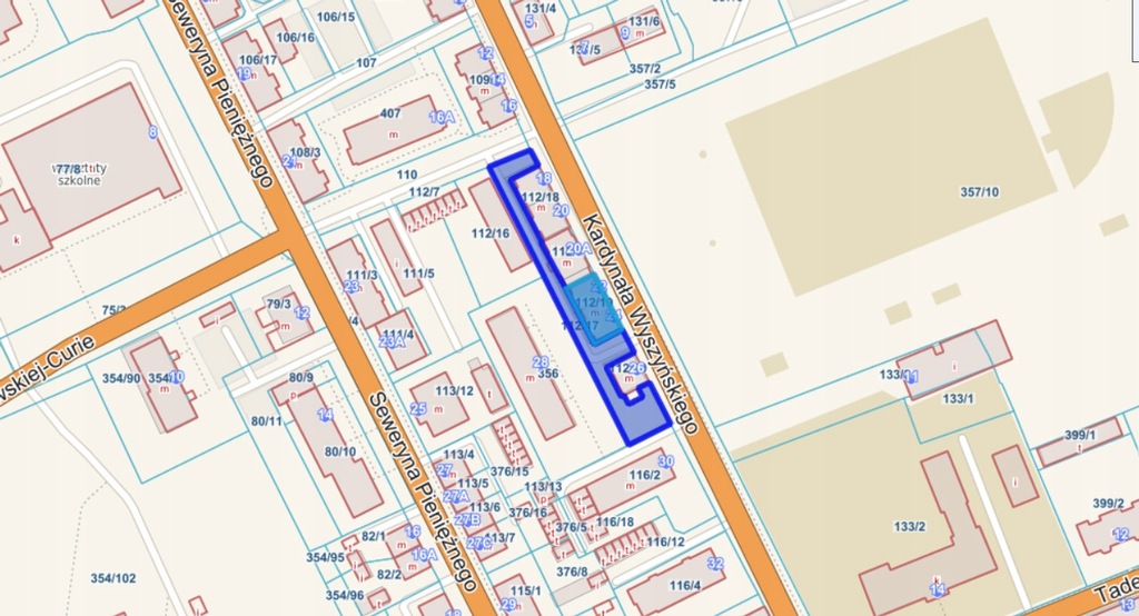 Działka nr 112/19 o pow. 236 m2 ma kształt prostokątny, a jej granice wyznacza obrys budynku mieszkalnego wielorodzinnego opisanego w ewidencji gruntów pod adresem Kardynała Wyszyńskiego 22 i 24. Przedmiotem sprzedaży jest udział wynoszący 168/8000 w prawie użytkowania wieczystego działki nr 112/17.