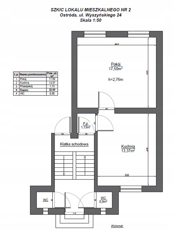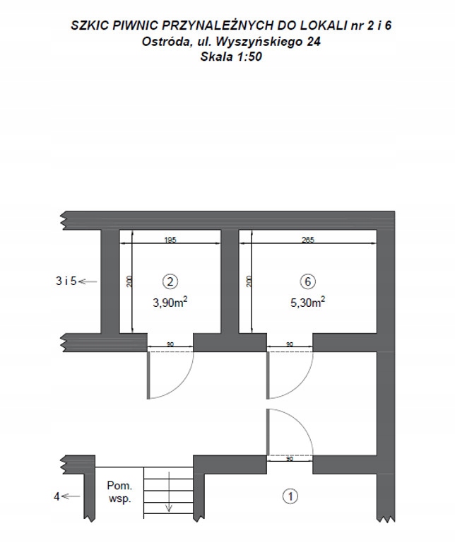 Lokal mieszkalny nr 2 o pow. 32 m2 jest usytuowanym na parterze budynku po prawej stronie klatki schodowej składający się z trzech pomieszczeń: kuchni o pow. 13,37 m2, pokoju- 17,50 m2, przedpokoju o pow. 1,13 m2 . Do lokalu przynależy WC o pow. 0,90 m2 znajdujące się poza lokalem, na półpiętrze z wejściem z klatki schodowej. Układ funkcjonalny pomieszczeń średni. Stolarka okienna i drzwiowa drewniana, podłogi drewniane pokryte płytami pilśniowymi oraz wykładziną PCV. Ściany wymagają renowacji oraz malowania. W pokoju znajduje się piec kaflowy. Ponadto, do lokalu przynależy piwnica o pow. 3,90 m2. Wszystkie instalacje są odłączone, a znajdująca się instalacja elektryczna i wodno-kanalizacyjna wymaga wymiany. Lokal mieszkalny jest pustostanem, kwalifikujący się do przeprowadzenia prac remontowych.