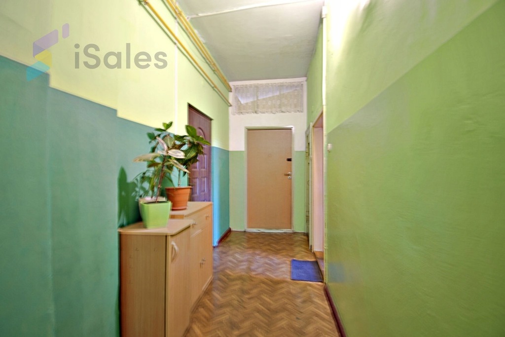 Mieszkanie ma nietypowy układ, pokoje są oddzielone od kuchni i łazienki korytarzem wspólnym dla dwóch innych mieszkań, zamykanym na klucz.