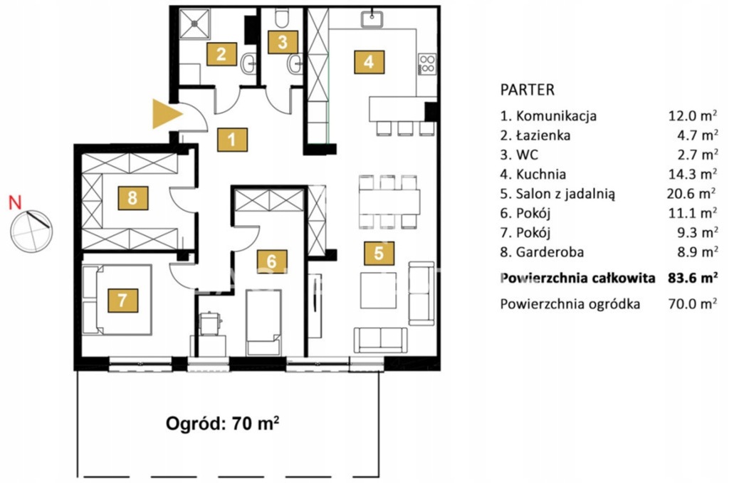 - Dodatkowe powierzchnie: ogród 70 m2, miejsce postojowe i komórka lokatorska w cenie