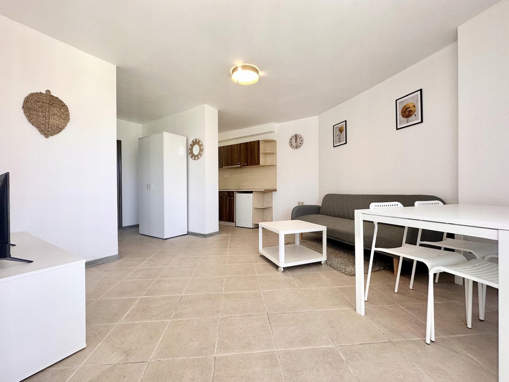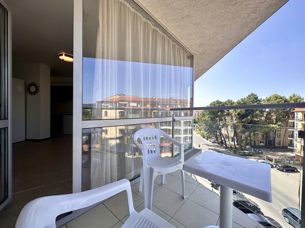 Charakterystyka obiektu - kawalerka znajduję się na piątym piętrze i składa się z: przedpokoju, salonu z aneksem kuchennym i częścią sypialnianą, łazienki z pełnym węzłem sanitarnym oraz tarasu z widokiem na kurort. Kawalerka jest sprzedawana z umeblowaniem. Opłata roczna wynosi 180 euro rocznie. Na terenie kompleksu znajduję się basen oraz parking.