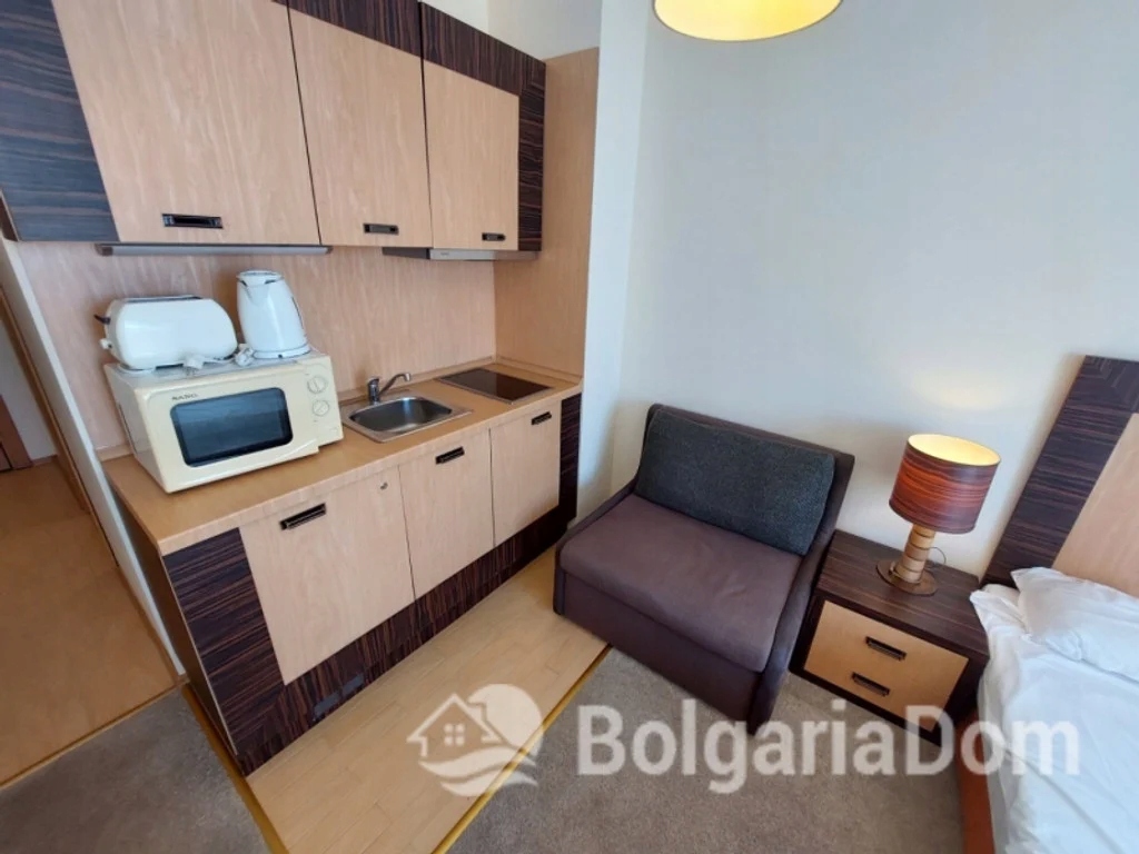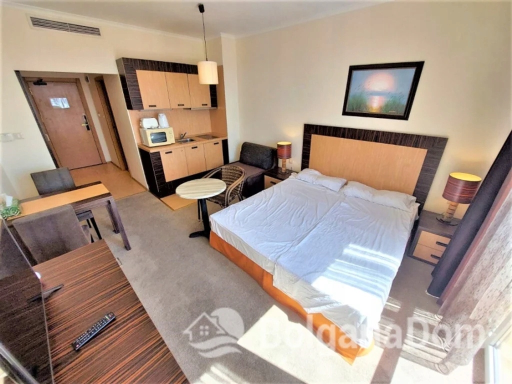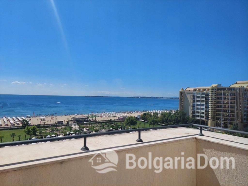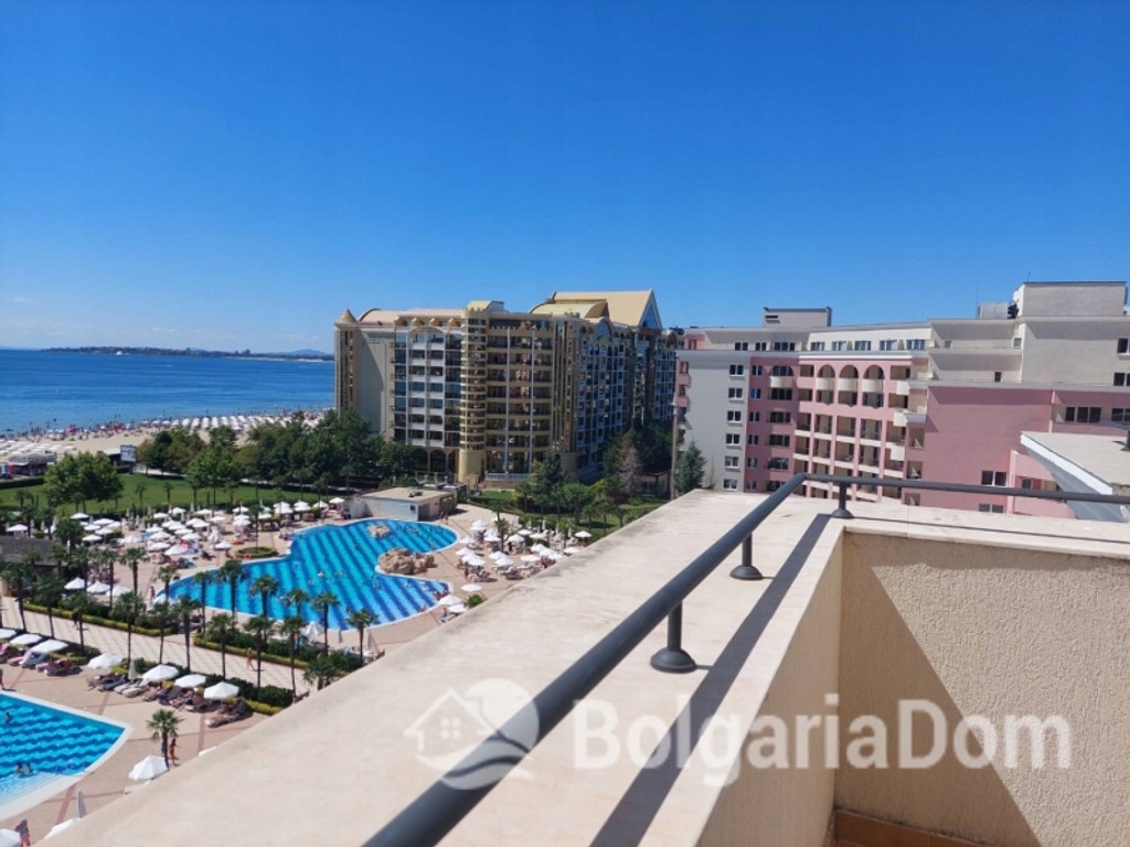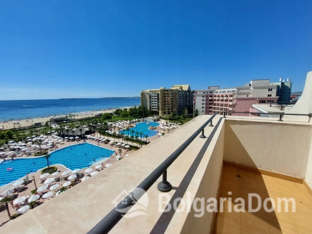Oferujemy na sprzedaż doskonałą kawalerkę z wyjątkowym, panoramicznym widokiem na morze w luksusowym aparthotelu w pierwszej linii, 50 metrów od plaży w kurorcie Słoneczny Brzeg.
