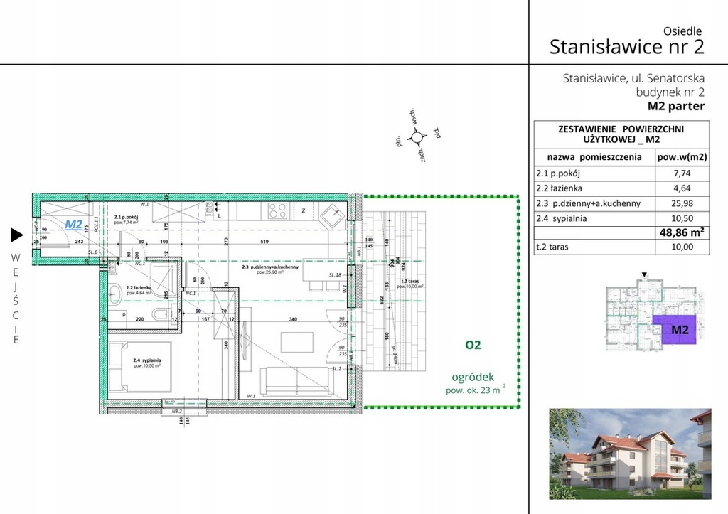 Na sprzedaż lokal mieszkalny (nr.2) o powierzchni 48,86m2 zlokalizowany na PARTERZE w budynku mieszkalnym wielorodzinnym. Mieszkanie dwupokojowe , w skład którego wchodzą następujące pomieszczenia: przedpokój, pokój dzienny z aneksem kuchennym, sypialnia, łazienka.