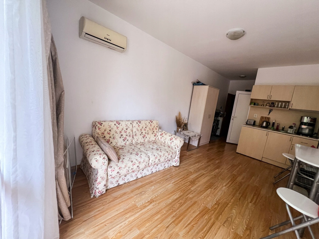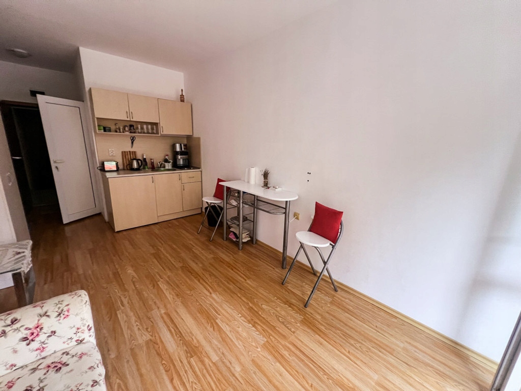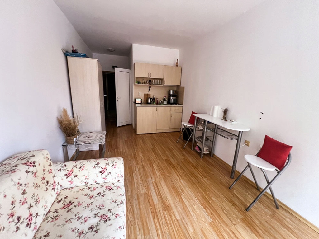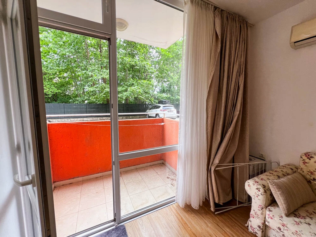 Na sprzedaż studio z balkonem na parterze w rezydencji Gerber 2 w Słonecznym Brzegu. Kompleks znajduje się w odległości krótkiego spaceru od plaży i zaledwie 400 metrów od głównego deptaka. W promieniu 5–7 minut spacerem od kompleksu znajdują się supermarkety, sklepy, różne restauracje i inne udogodnienia. Gerber 2 oferuje basen z częścią dla dzieci, plac zabaw dla dzieci, całoroczną ochronę i utrzymanie, parking.