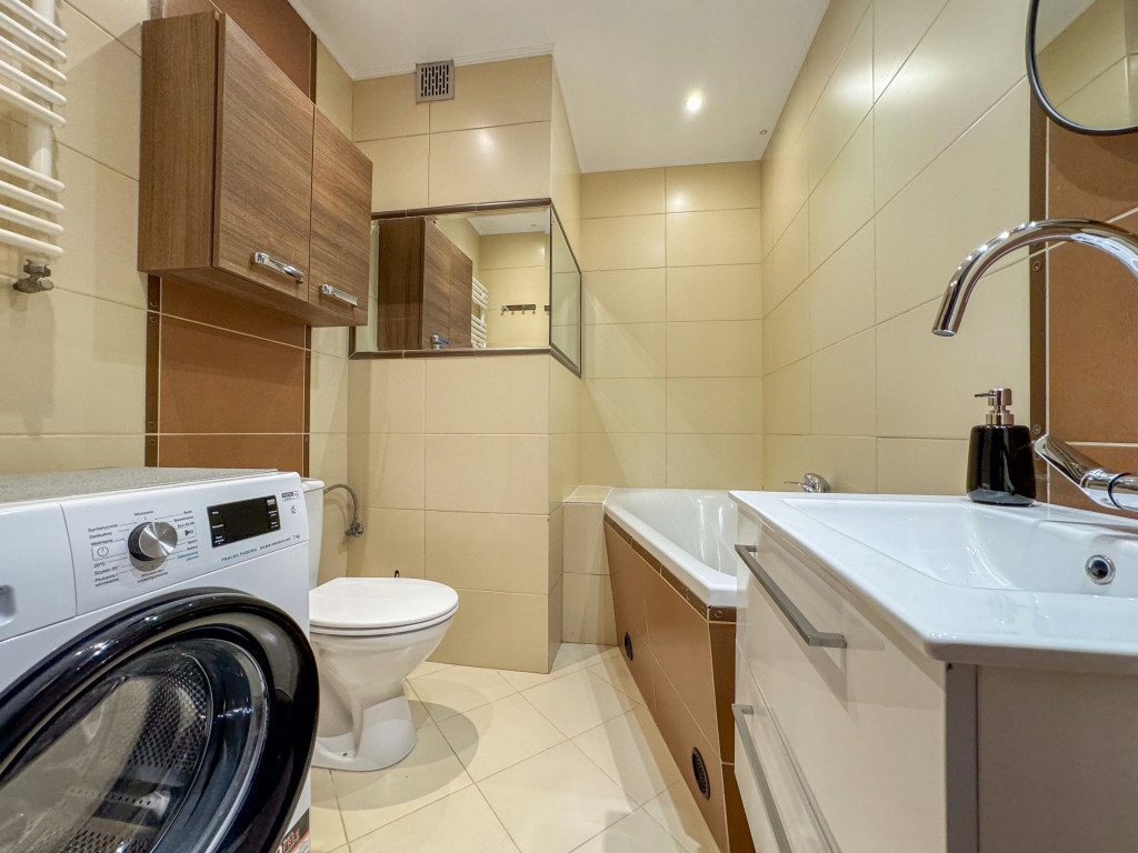 W kuchni w ciągu szafek stojących i wiszących znajduje się lodówko-zamrażarka, kuchnia gazowa, piekarnik elektryczny, zmywarka oraz okap kuchenny. W kuchni znajduje się stół przy którym można zjeść domowe posiłki. W łazience oprócz wanny, umywalki z lustrem, sedesu znalazło się miejsce na pralkę. W przedpokoju jest też druga szafa typu Komandor.