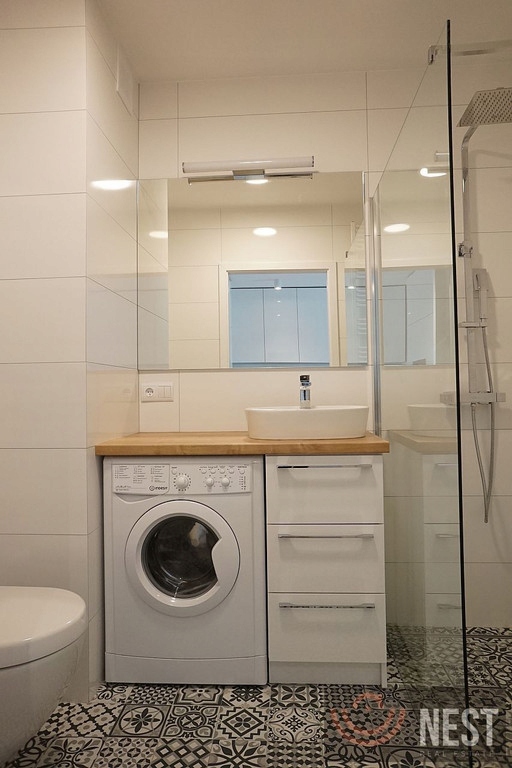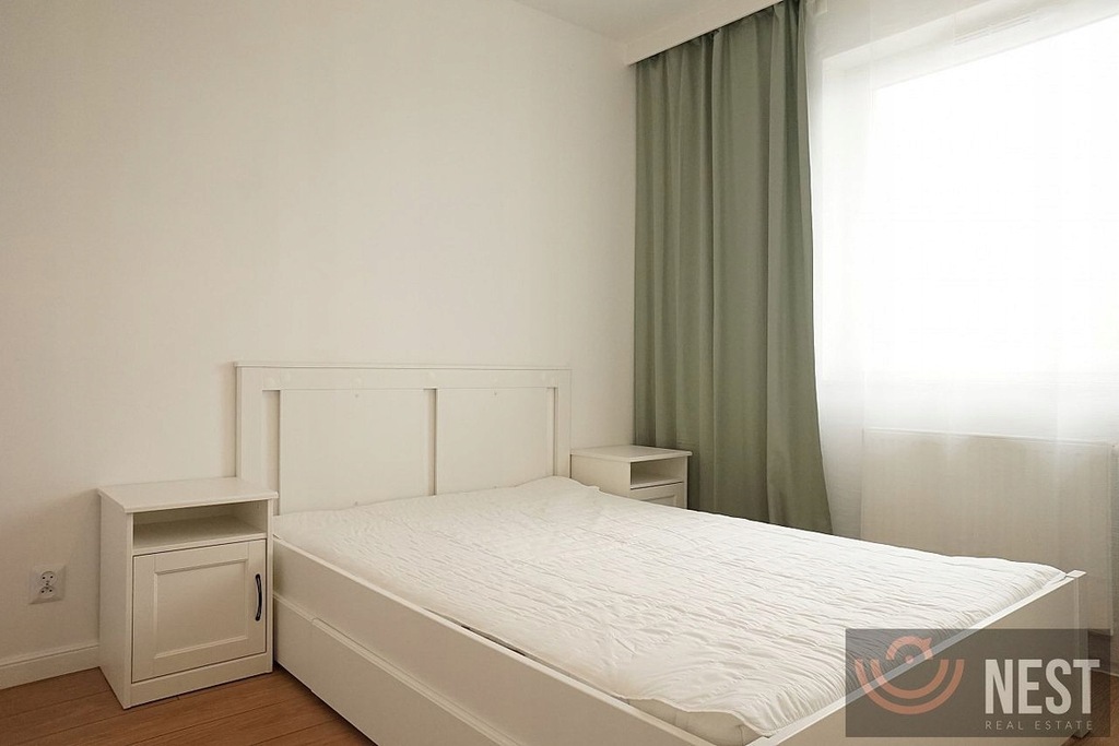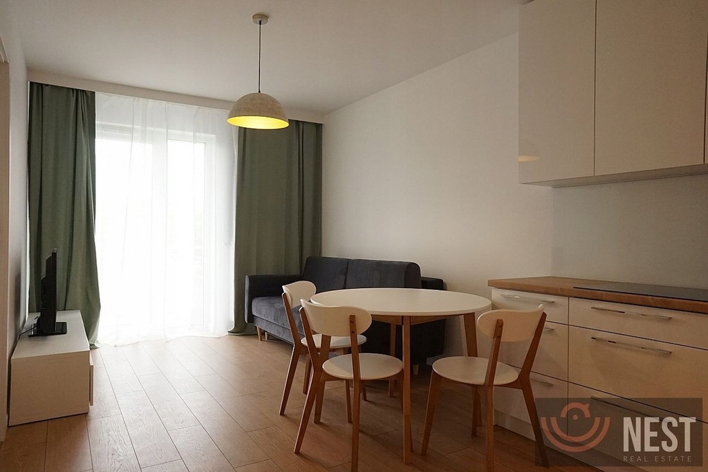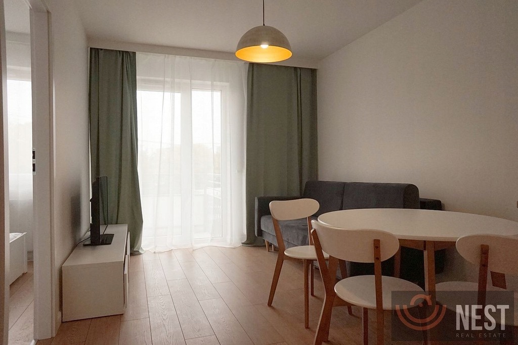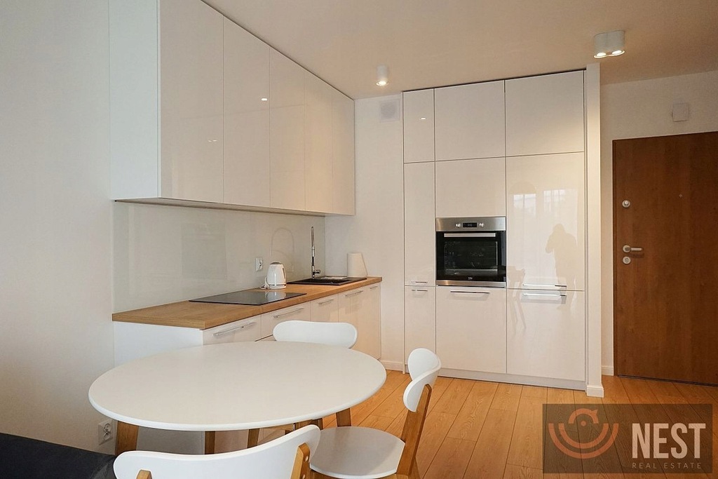 FOR RENT: A 1-bedroom apartment located in a newly built apartment building at Powstańców Śląskich. The apartment`s area of 35 sqm consists of a living room with kitchenette, bedroom, bathroom and hall. The living room has a sofa, coffee table and TV. The kitchen is equipped with a fridge, a dishwasher, an induction hob, an oven and table with chairs. The bedroom has a double bed with a mattress a spacious built-in wardrobe. The bathroom is equipped with a shower, mirror a washbasin, a washing machine and a mirror.