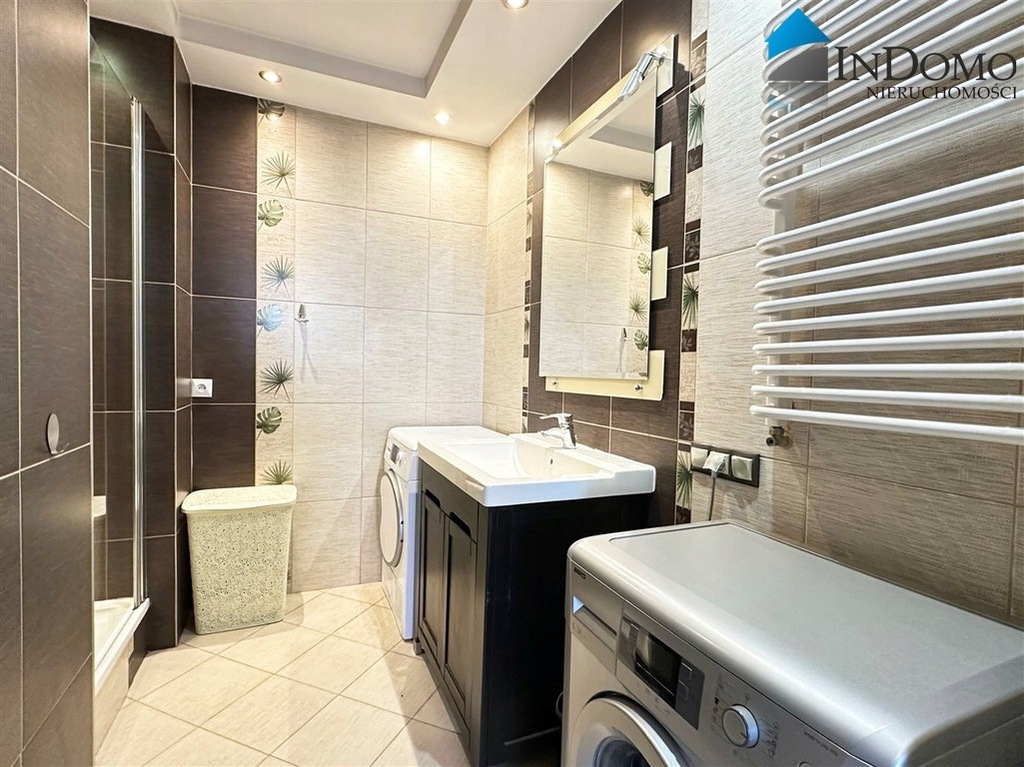 osobna łazienka z kabiną prysznicową, pralką i suszarką