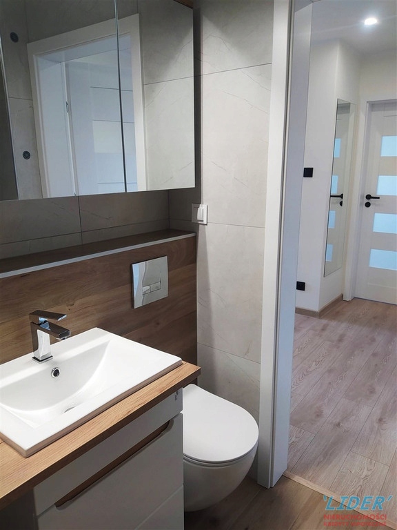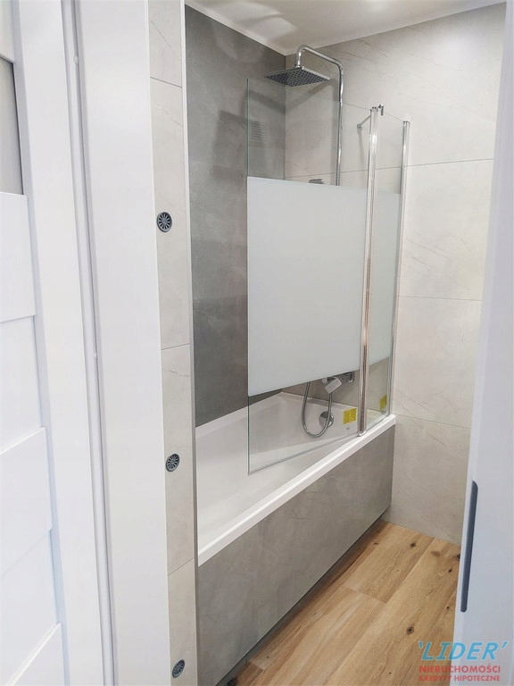 Łazienka w nowoczesnej glazurze. Komfortowym rozwiązaniem jest wanna z deszczownicą oraz ruchomymi, szklanymi drzwiami prysznicowymi. Na całej długości jednej ze ścian pojawia się wygodna szafka z lustrem, która pomieści dużą ilość rzeczy. Obok umywalki znajduje się przestrzeń, którą można zagospodarować poprzez umiejscowienie tam pralki. Wymienione piony wodne oraz instalacja elektryczna.