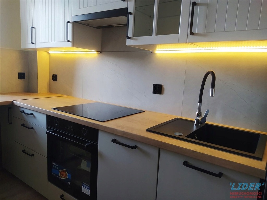 Kuchnia w zabudowie, wyposażona jest w nowe sprzęty AGD m.in w płytę indukcyjną, piekarnik oraz zmywarkę. Jednym z atrybutów tego pomieszczenia są lampy ledowe pod szafkami, które będą idealnym rozwiązaniem dla miłośników gotowania w wieczornych porach, nadają one bardzo przytulny klimat.