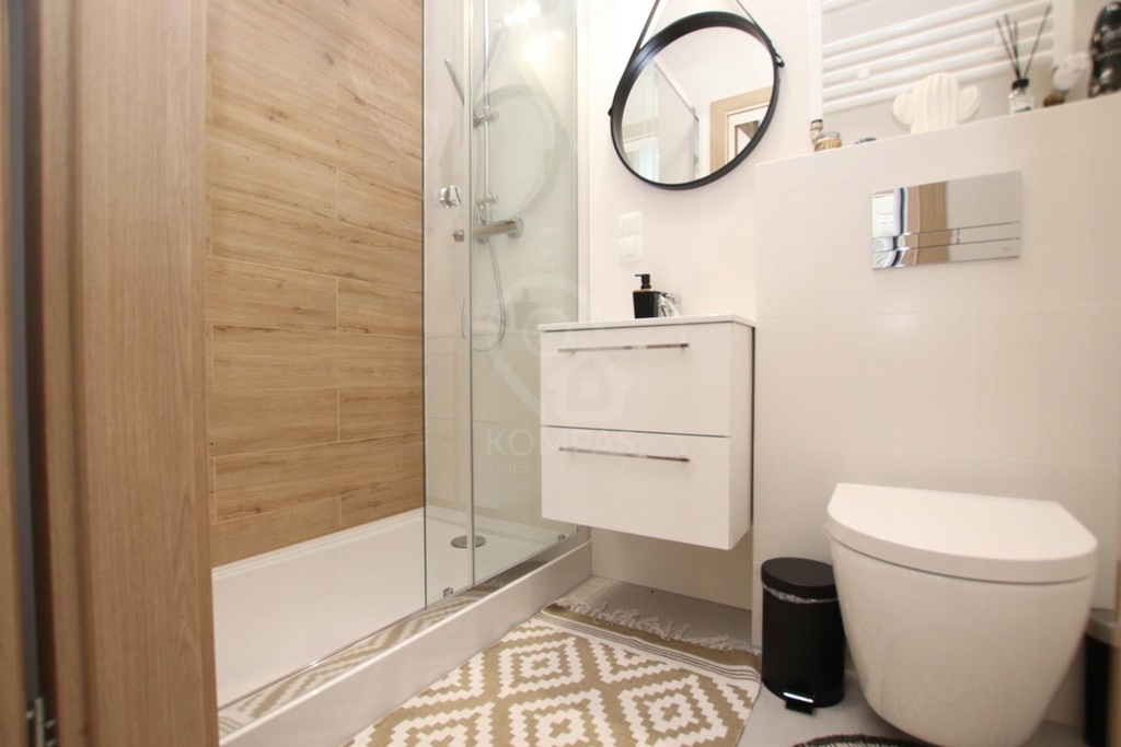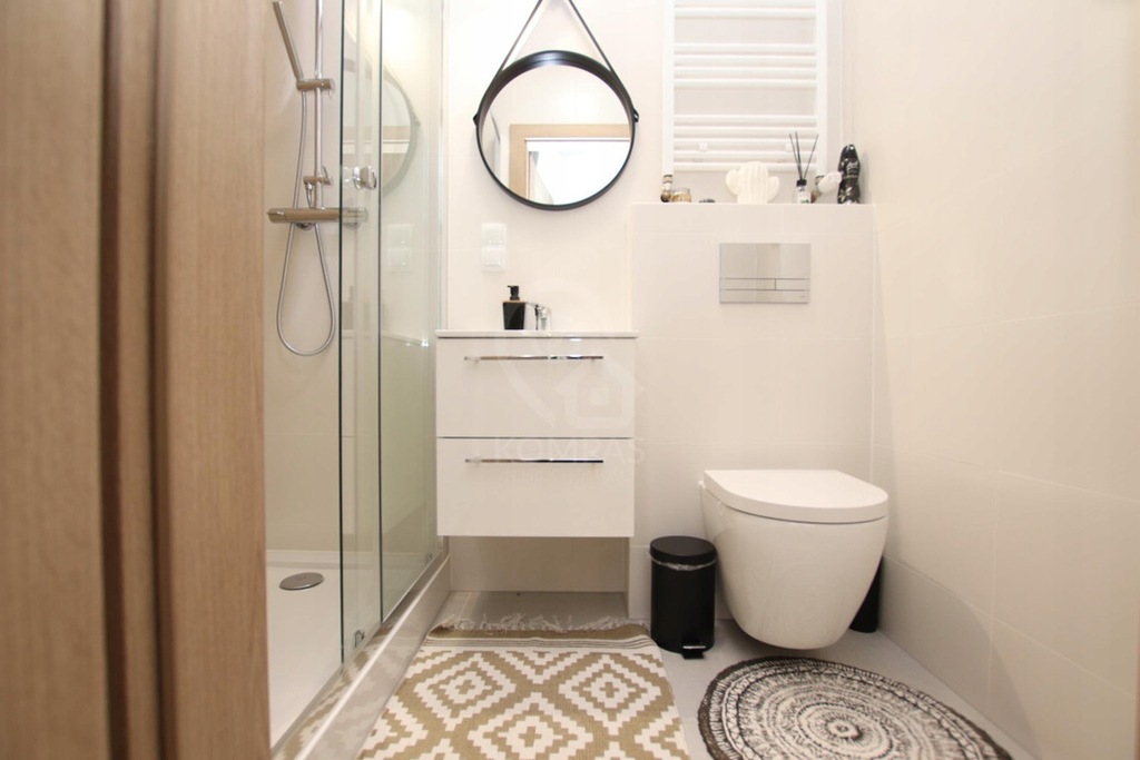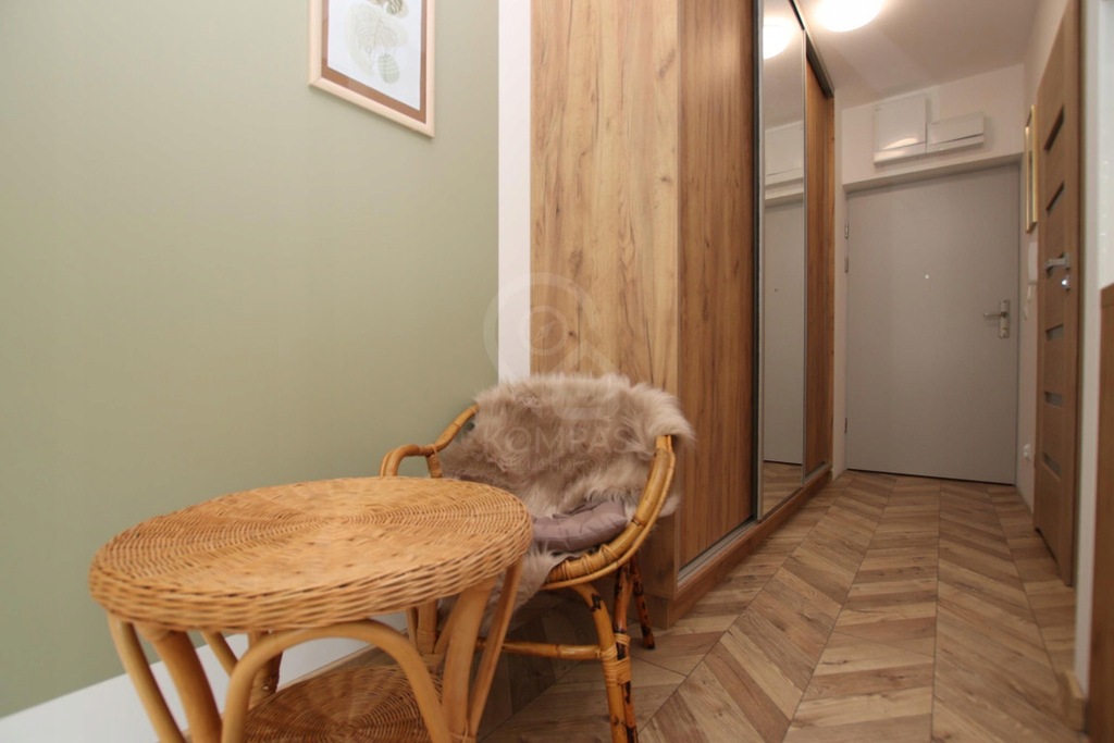 Aneks kuchenny z meblami w zabudowie wraz ze sprzętem AGD (lodówka, płyta indukcyjna, zmywarka, okap, pralko-suszarka). W przedpokoju pojemna szafa typu Komandor. Łazienka z kabiną prysznicową, umywalką oraz WC. W salonie rozkładana sofa z funkcją spania. MOŻLIWOŚĆ DOPOSAŻENIA POD POTRZEBY NAJEMCY.