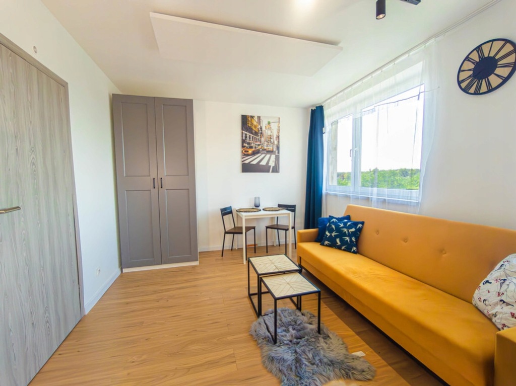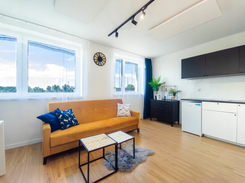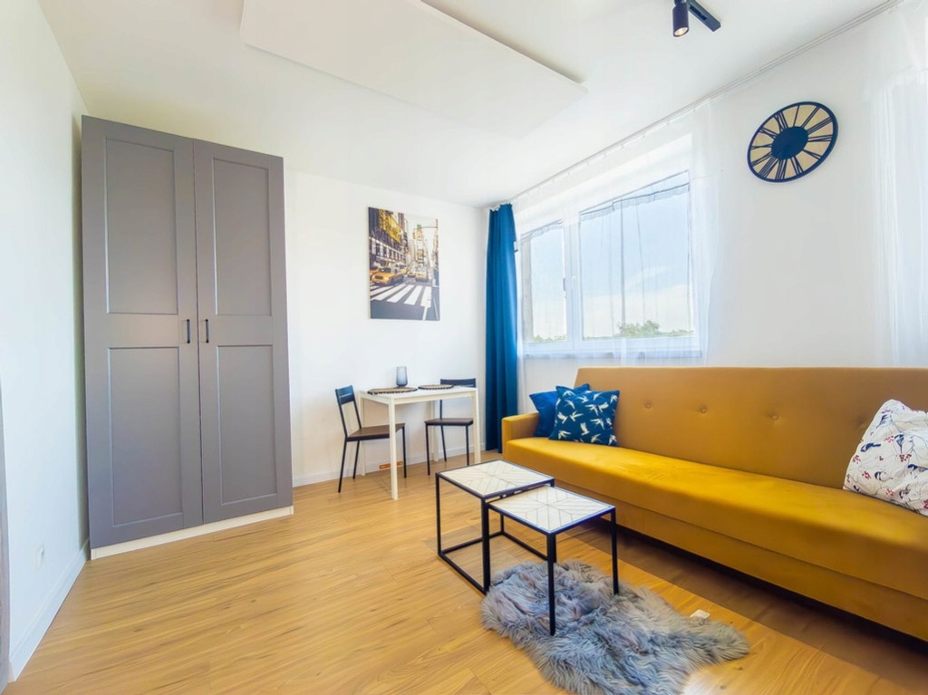 Mieszkanie składa się z jednego pokoju, w którym znajduje się szafa, stół z krzesłami oraz rozkładana kanapa.