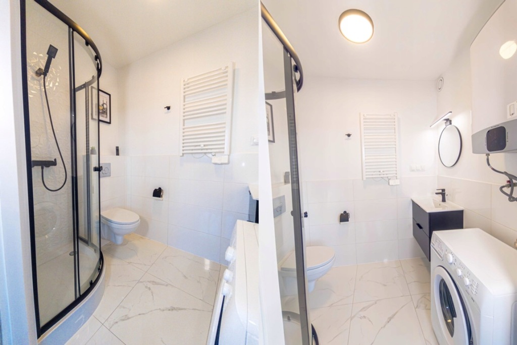 Łazienka wyposażona jest w prysznic, toaletę oraz pralkę.