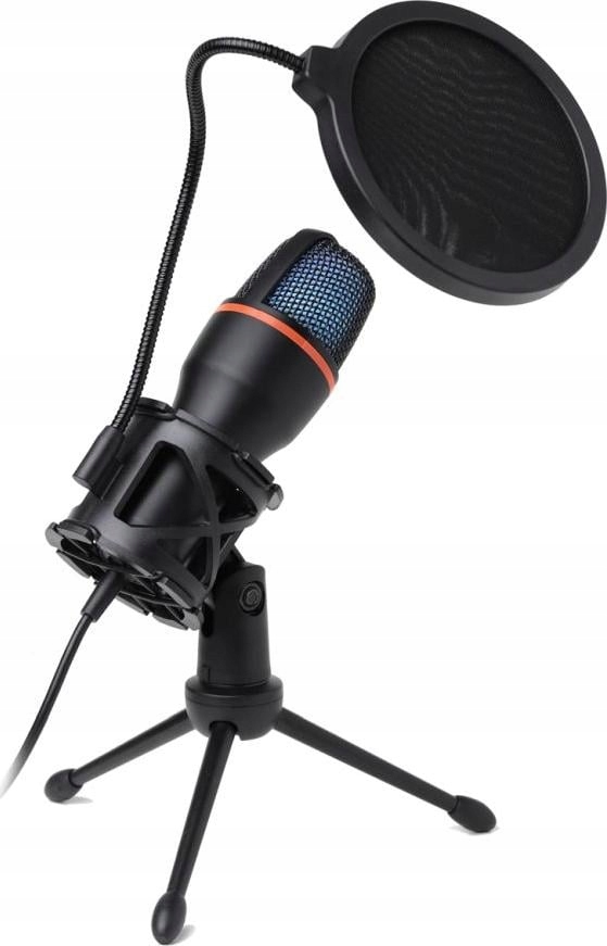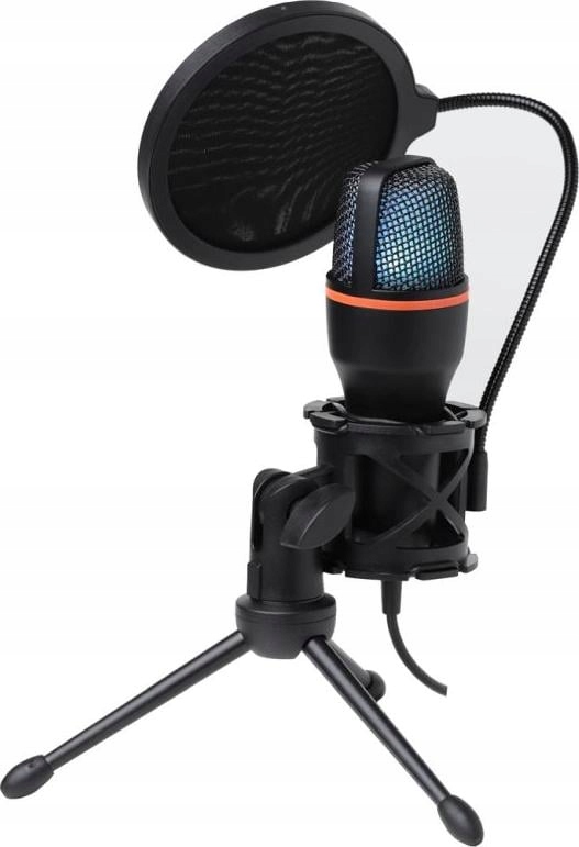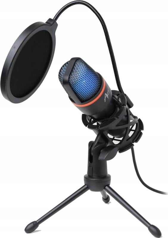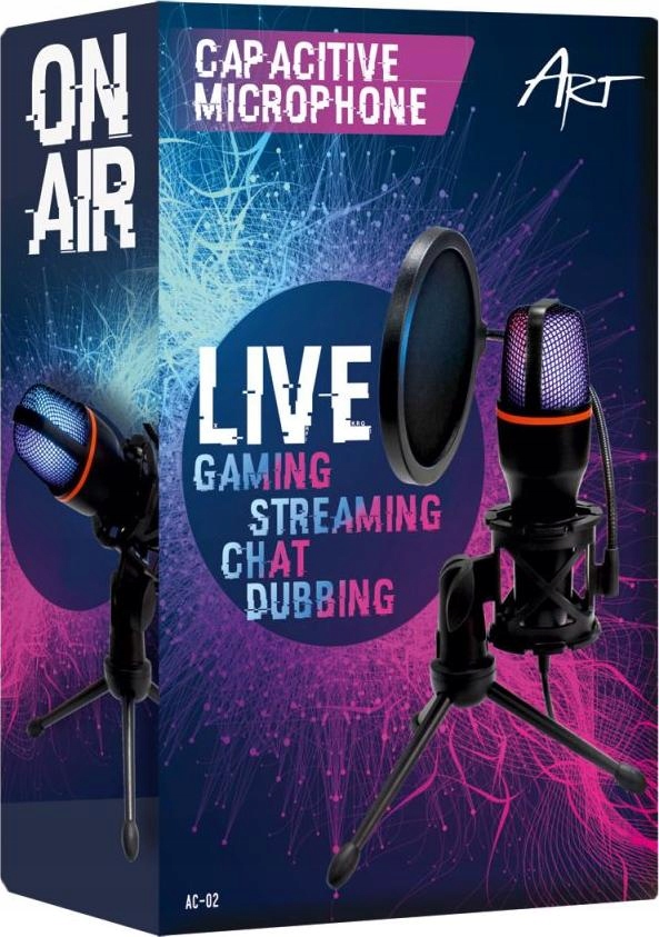 AC-02 w praktyce ma wszystko to czego potrzebujesz, aby jakość nagrań była zadowalająca. Wygodny trójnóg nie zajmuje dużo miejsca na biurku, pozwala ustawić mikrofon w dogodnym miejscu, a dodatkowa regulacja ułatwia dobranie optymalnego kąta nachylenia. Statyw wyposażony jest w koszyczek antywstrząsowy, niwelujący przenoszenie się niepożądanych i przypadkowych dźwięków na membranę mikrofonu. Dodatkowo zestaw zawiera filtr POP, który jest nieodzownym towarzyszem profesjonalnych rozwiązań. Filtr ten minimalizuje wydźwięk tzw. głosek wybuchowych, co w zdecydowanym stopniu wpływa na jakość nagrania. Mikrofon znajduje się w czarnej eleganckiej matowej obudowie. Dla podkreślenia multimedialnych właściwości mikrofonu AC-02 zastosowano diodę led RGB.
