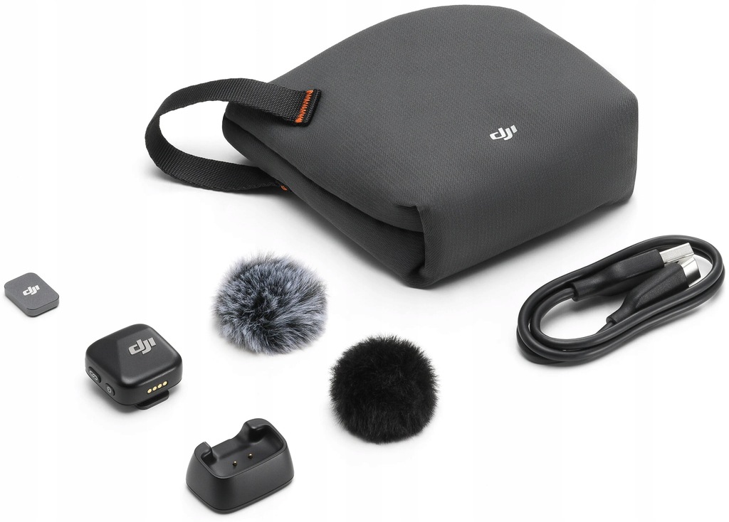 - Dołączone akcesoria: Kabel do ładowania USB-C, Kompaktowa torba transportowa, Magnetyczny klips, Nadajnik DJI Mic Mini (czarny), Osłona przeciwwietrzna (czarna / szara), Osłona przeciwwietrzna (szara), Stacja dokująca do ładowania nadajnika DJI Mic Mini