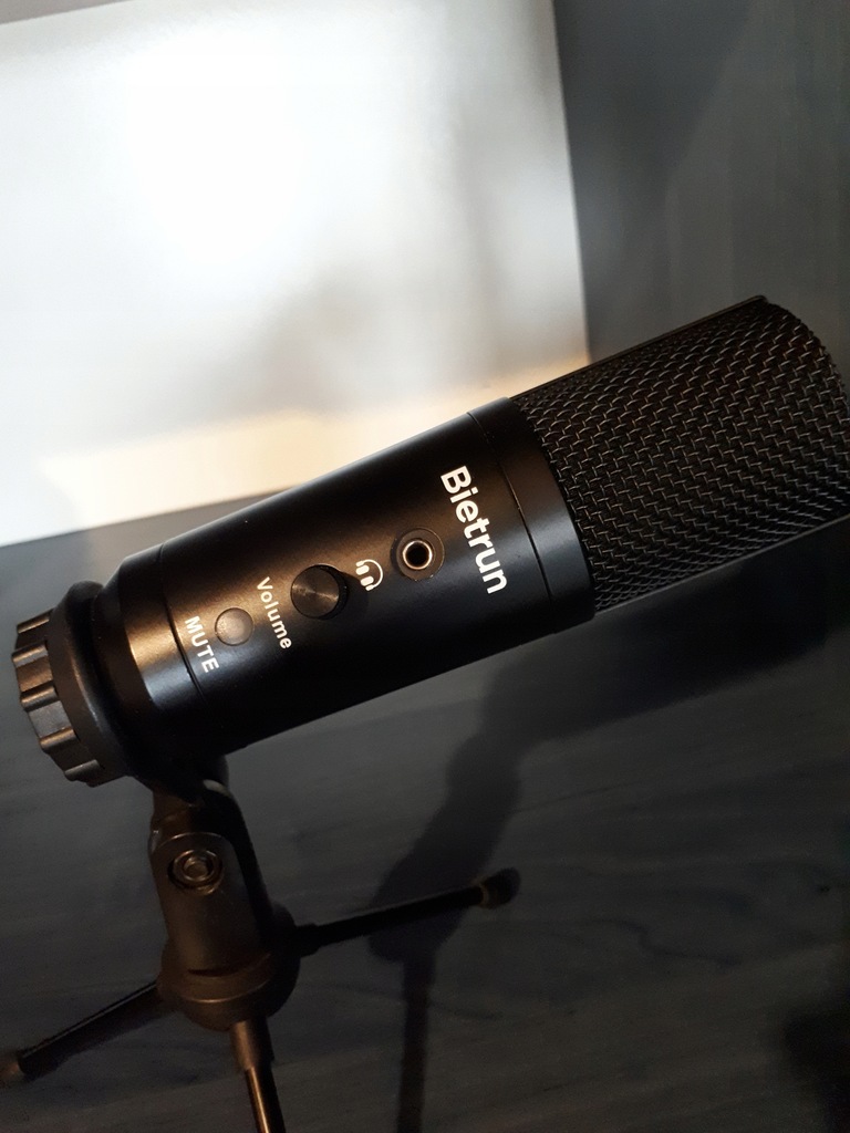 Bietrun Mikrofon USB do komputera, laptopa, metalowy, ze stojakiem na statyw, gniazdo słuchawkowe, przełączanie wyciszenia, mikrofon kondensatorowy do gier i podcastów, PS4, Skype Zoom, YouTube Mac Windows