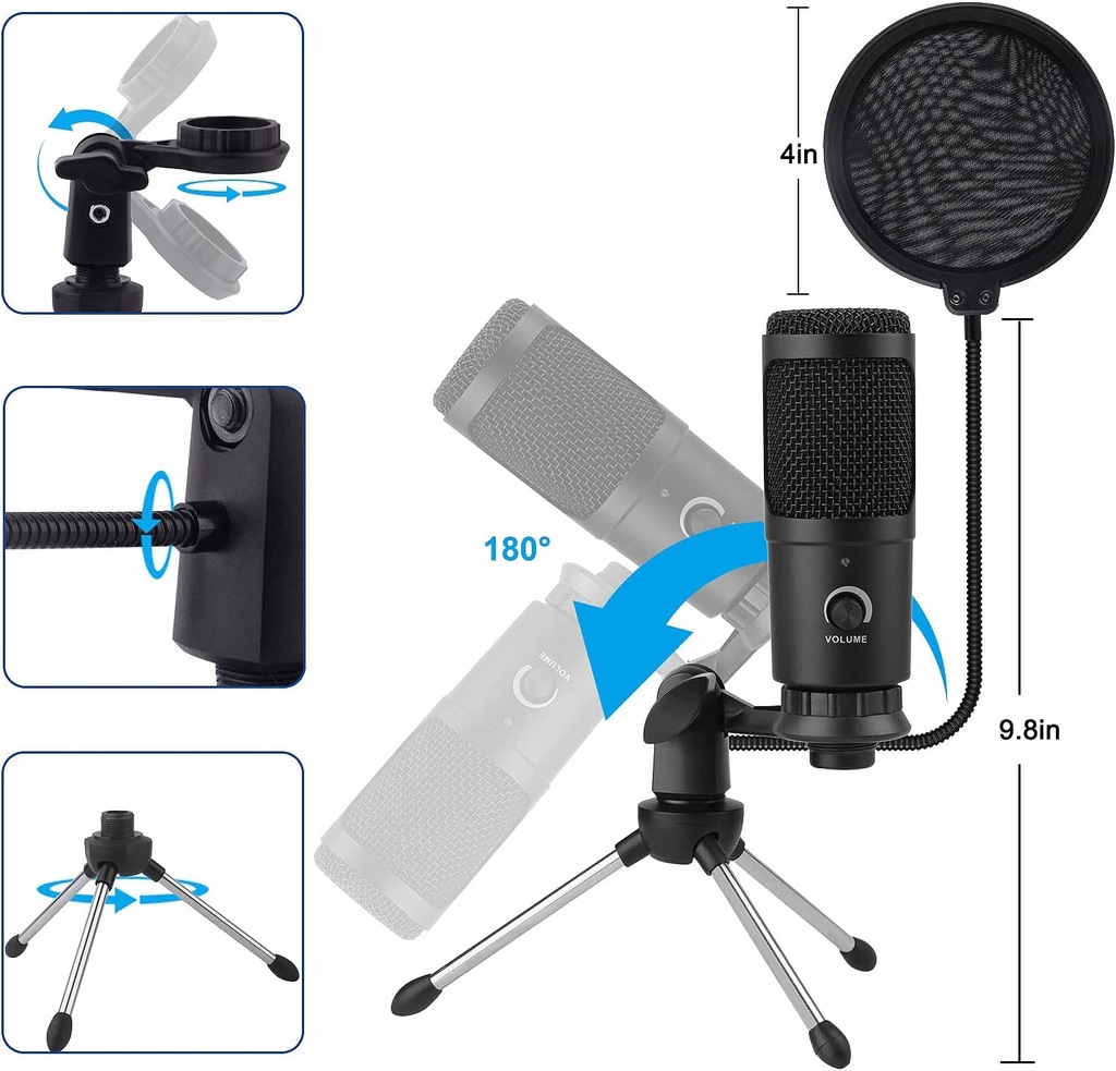 - Regulowany i łatwy w instalacji: mikrofon zawiera stabilny i regulowany statyw. Mikrofon do komputera jest wyposażony w metalowy uchwyt, aby zapewnić płynne nagrywanie bez obawy o przerwy podczas kolizji. Regulowany kąt stojaka 180 stopni pomaga znaleźć najlepszą metodę fotografowania. Odłączana i składana konstrukcja mikrofonu głosowego pozwala zabrać go ze sobą.