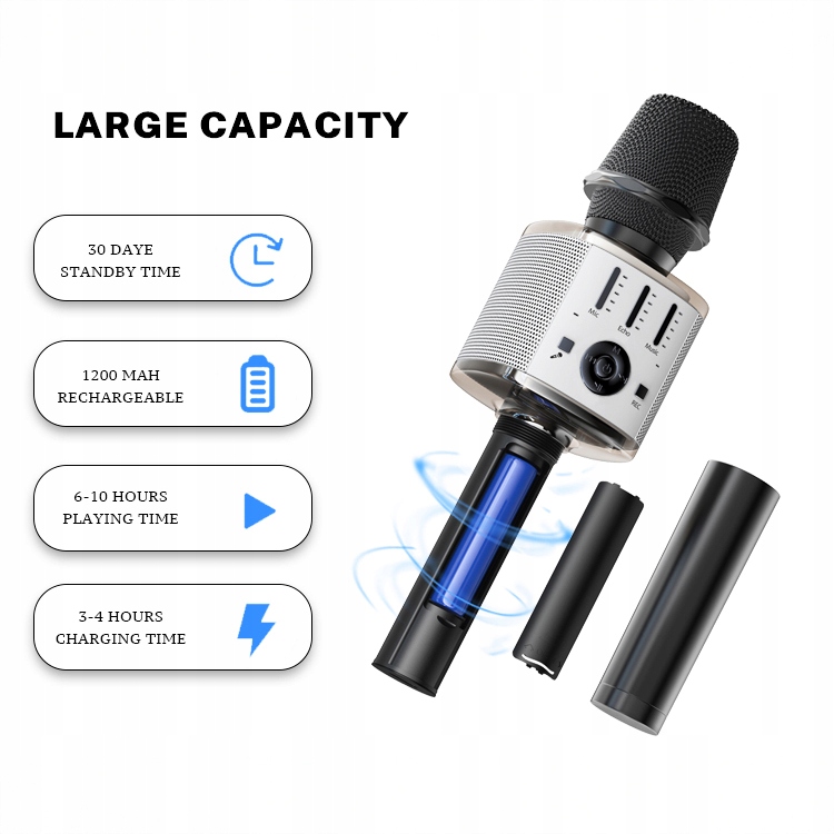 - Tryb duetu – Możliwość połączenia dwóch mikrofonów jednocześnie dla wspólnego karaoke.