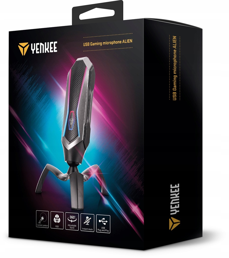 ALIEN to wyjątkowy mikrofon USB, stworzony z myślą o entuzjastach gier, streamerach i osobach zajmujących się tworzeniem treści. Jego podświetlany efekt RGB, dostępny w 4 trybach i 7 kolorach, nadaje profesjonalny wygląd każdej konfiguracji. Dzięki charakterystyce kardioidalnej, mikrofon skupia się na źródle dźwięku, eliminując niechciane hałasy z otoczenia. Prosta obsługa obejmuje jednoprzyciskowe wyciszanie i łatwą zmianę podświetlenia. Mikrofon ALIEN można swobodnie umieścić na ramieniu mikrofonu dzięki standardowemu gwintowi 5/8", a jego kompatybilność z różnymi platformami (Windows, Mac, PS3/PS4, Android, iOS) sprawia, że jest idealnym narzędziem dla każdego kreatywnego zastosowania.
