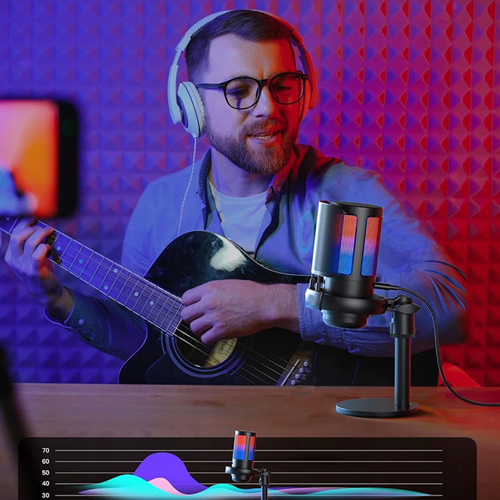 🎙️Ten telefon komórkowy z mikrofonem pojemnościowym ma na górze przycisk wyciszania, który jest wygodny w dotyku. Mikrofon PC wycisz światło RGB i włącz wyciszenie światła RGB.
