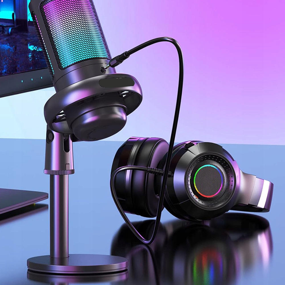 🎙️🌈Mikrofon z amortyzującą podstawką Efekt świetlny RGB Przycisk wyciszenia Gniazdo słuchawkowe 3,5 mm🌈🎙️
