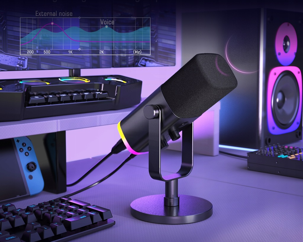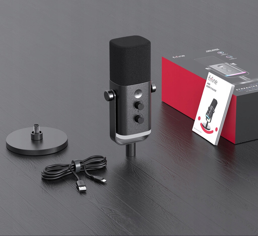 FIFINE AM8 to mikrofon dynamiczny z przewodowym złączem USB i XLR, który idealnie nadaje się do nagrywania podcastów, strumieni, lektorów i transmisji. Posiada kardioidalną membranę, która zapewnia wysoką jakość i szczegółowość głosu. W zestawie znajduje się statyw umożliwiający wygodne umieszczenie mikrofonu na stole. Posiada wyjście słuchawkowe do monitorowania głosu w czasie rzeczywistym. Podświetlenie RGB mikrofonu pozwala stworzyć wyjątkową atmosferę podczas nagrywania.