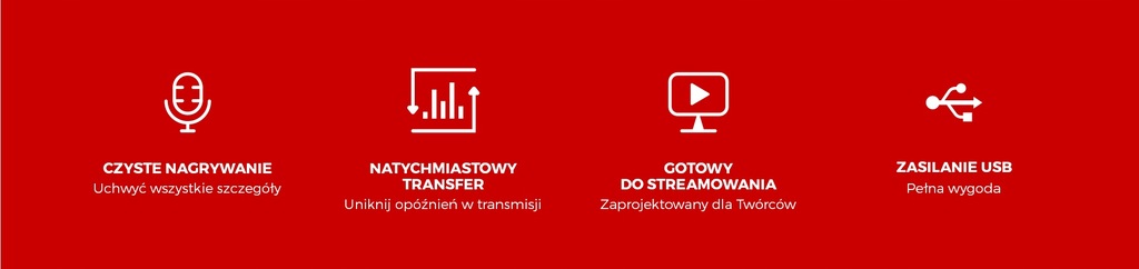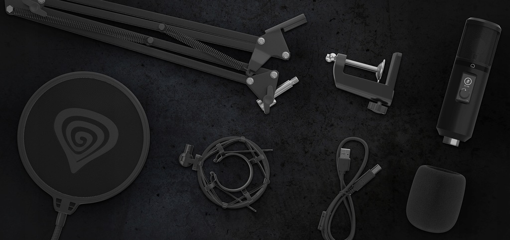 - Akcesoria w zestawie: Gąbka na mikrofon, Kosz na mikrofon, Pop-filtr, Kabel USB, Ramię mikrofonowe, Instrukcja obsługi