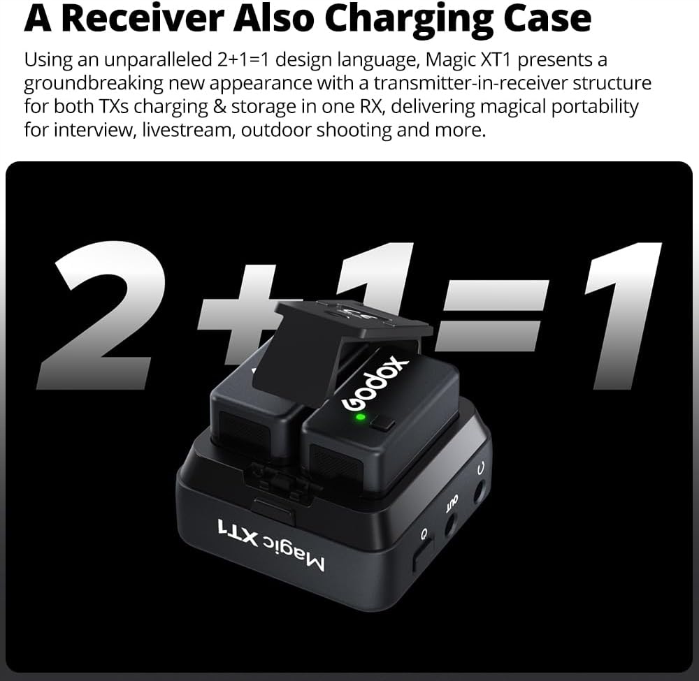 - Magic XT1 ma przełomowy wygląd dzięki strukturze nadajnika w odbiorniku, która umożliwia ładowanie i zapisywanie obu TX w jednym RX, co zapewnia magiczną przenośność podczas wywiadów, transmisji na żywo, nagrań na zewnątrz i nie tylko