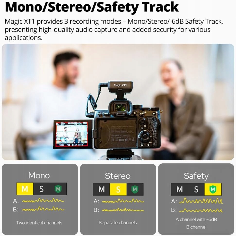- Magic XT1 oferuje 3 tryby nagrywania – mono/stereo/-6dB Safety Track, które zapewniają wysokiej jakości nagrywanie audio i dodatkowe bezpieczeństwo dla różnych zastosowań