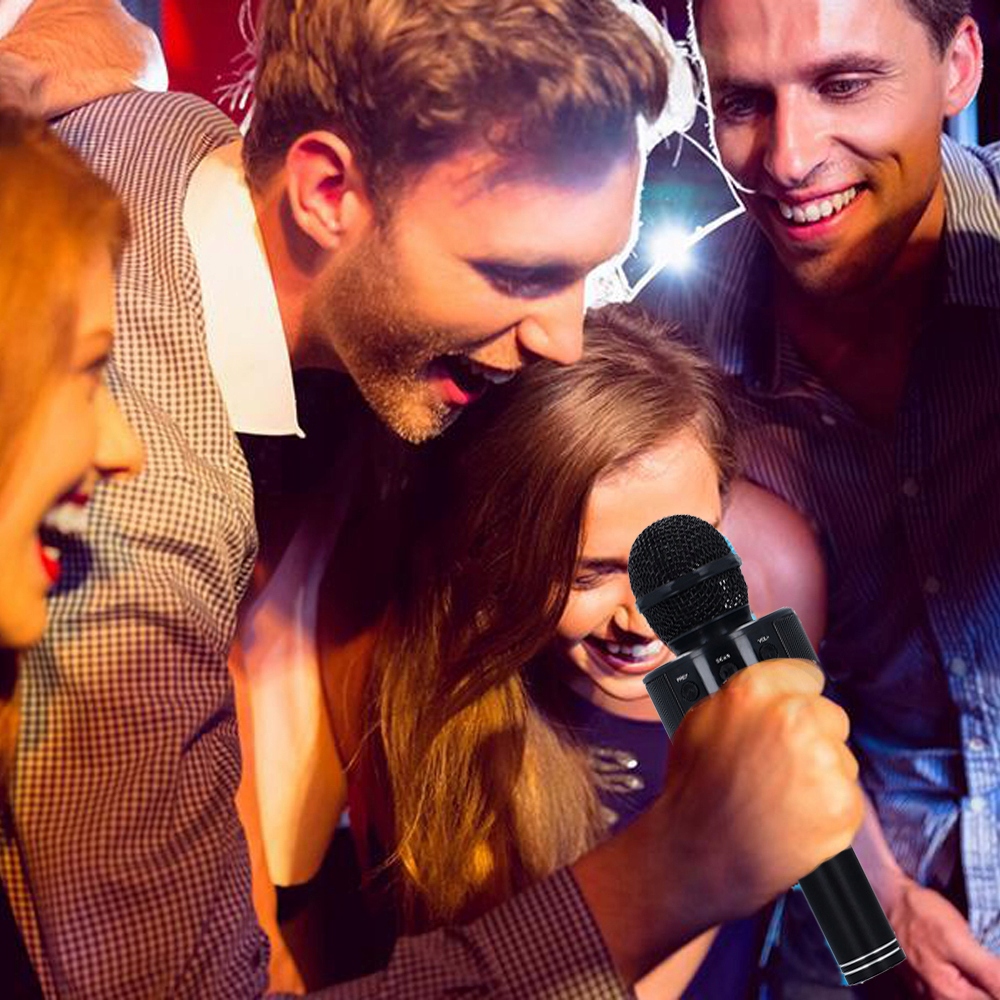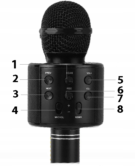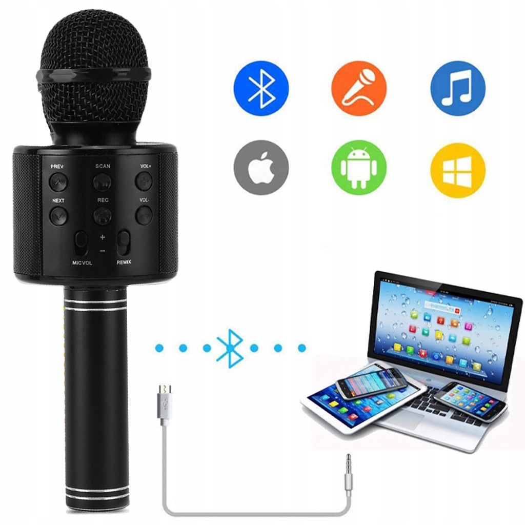 Mikrofon łączymy za pomocą bluetooth z telefonem, tabletem, telewizorem SMART, posiadającym system operacyjny ANDROID lub IOS. Po podłączeniu mikrofonu uruchomiona muzyka będzie odtwarzana na wbudowanym głośniku w mikrofonie w klasyczny sposób jak w głośnikach bezprzewodowych. Następnie uruchamiamy odtwarzacz muzyki lub program do Karaoke lub kanał Youtube i puszczamy wybrany kawałek muzyki.
