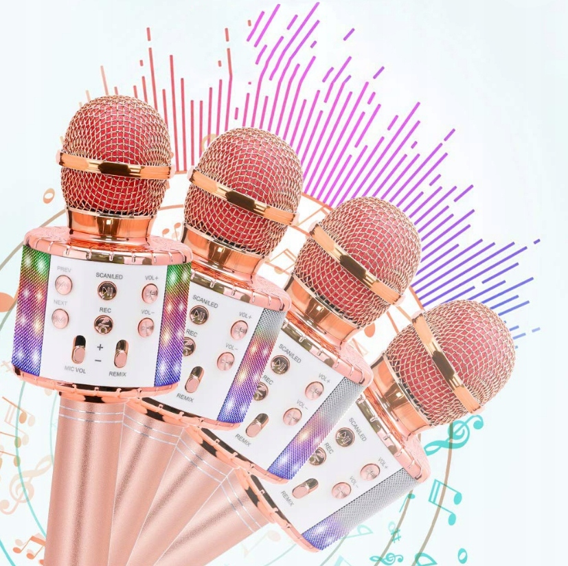 połyskliwy, metaliczny kolor jest zawsze bardzo na topie. Efektownego designu dopełnia delikatne podświetlenie głośników, które po włączeniu świecą na niebieski kolor. Do wyboru są aż 3 kolory mikrofonów – czarny, rose-gold (miedziany) oraz złoty. Jest to doskonały pomysł na prezent, niezależnie od wieku.