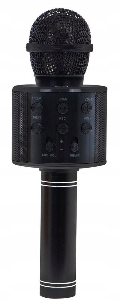 Mikrofon Karaoke to idealny prezent dla wszystkich dzieci i nastolatków, które uwielbiają śpiewać. Wbudowana w telefon bateria litowo-polimerowa umożliwia nawet kilku godzinne działanie zabawki. Można go zabrać ze sobą wszędzie i nie martwić się o szybkie wyczerpanie baterii. Mikrofon wyposażony został w dwa wbudowane głośniki, funkcję redukcji szumu oraz opcję ustawień basów i sopranów. Mikrofon nadaje się do śpiewania, nagrywania oraz karaoke. Można go połączyć ze smartfonem, tabletem lub telewizorem z systemem operacyjnym Android lub iOS. Działanie mikrofonu jest bardzo proste. Po podłączeniu go do urządzenia z systemem Android lub iOS, wybrana muzyka z tego urządzenia będzie odtwarzana na mikrofonie za pomocą bezprzewodowego głośnika. Należy uruchomić odtwarzacz muzyki lub program do Karaoke bądź kanał Youthube i puścić wybraną piosenkę. Dźwięk będzie odtwarzany na dwóch wbudowanych w mikrofon głośnikach. Na ekranie urządzenia z którym połączony jest mikrofon wyświetli się tekst, który możemy śpiewać. Podczas śpiewu nasz głos nakłada się na muzykę i jednocześnie wydobywa z wbudowanych głośników. Podczas śpiewu istnieje możliwość regulacji siły głosu, głośności podkładu muzycznego, siły basów i sopranów. Możemy nakładać również efekt echo. Na mikrofonie i w jego dolnej części znajdują się następujące przyciski: - PREV - poprzednie nagranie, - NEXT - następne nagranie, - SCAN, - VOL + /-, - REC - nagrywanie, - MIC VOL +/-, - REMIX, - wejście na kabel Micro USB/ USB, - wejście na kabel AUX, - wejście na kartę SD.