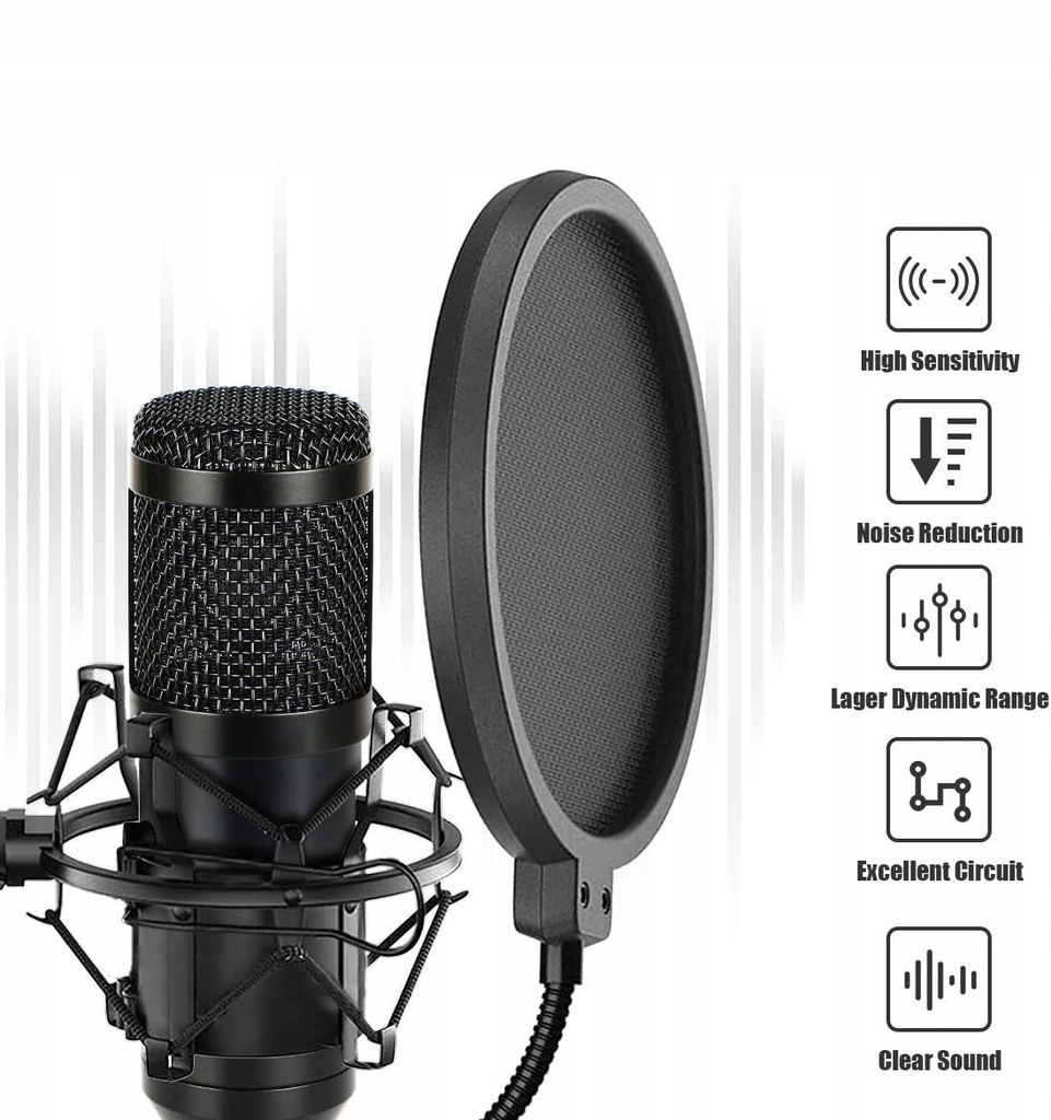 - Pop-filtr z podwójną membraną, która skutecznie filtruje wszelkie niepożądane podczas nagrania studyjnego dźwięki, jak np. tzw. wybuchowe głoski " P,B,T lub D" zapobiega zniekształceniom i przesterom sygnału.