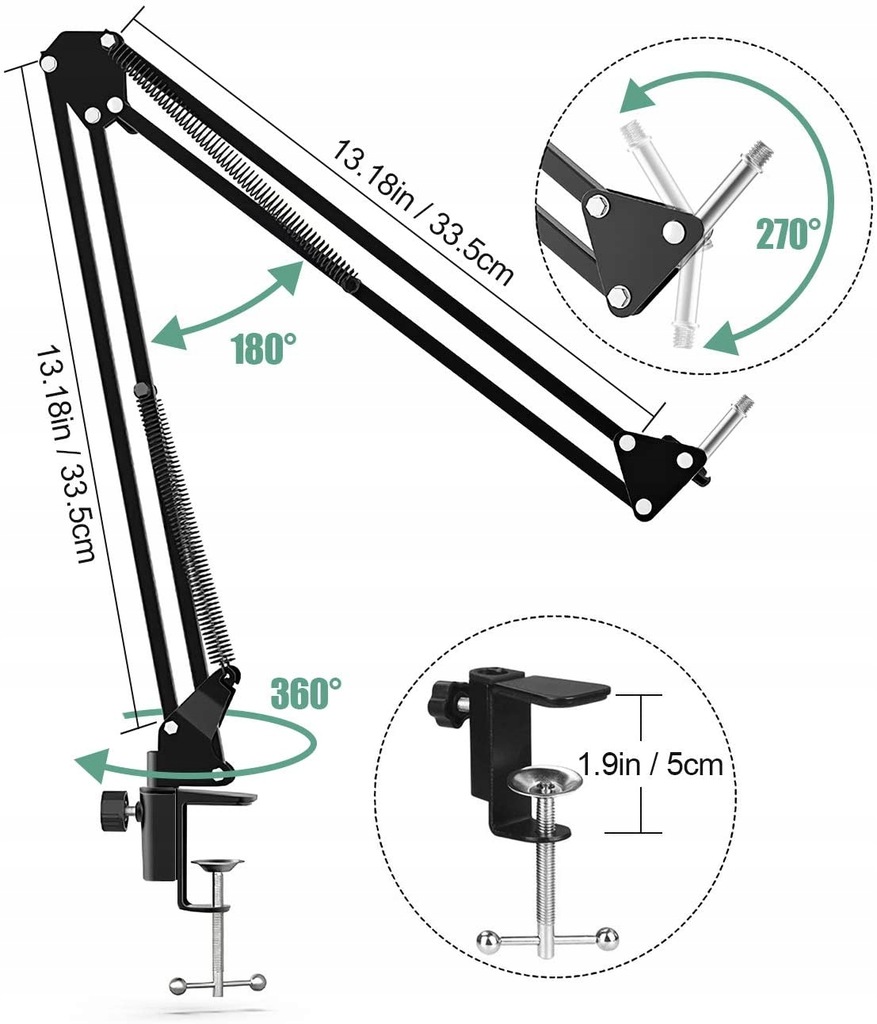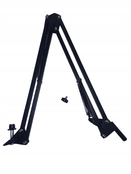 - Składane nożycowo ramię z zaciskiem typu imadło, umożliwiającym montowanie zestawu do blatu stołu czy biurka, dzięki któremu ustawisz mikrofon w odpowiedniej pozycji względem ust.