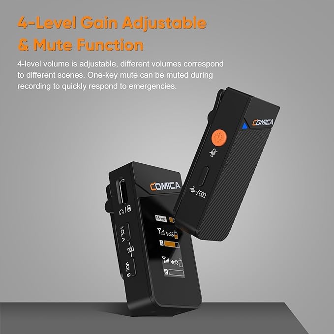 Bezprzewodowy mikrofon Lavalier Vimo C marki Comica jest wyposażony w wyświetlacz IPS do monitorowania audiodynamiki, czasu pracy baterii, głośności i trybów podczas nagrywania. Jest obrotowy, aby dostosować się do różnych kierunków monitorowania.