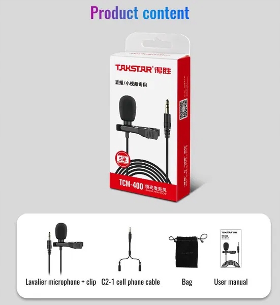 Mikrofon lavalier Takstar TCM-400 z kablem o długości 5 m