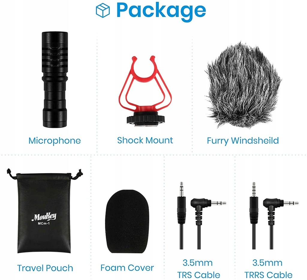 - Uniwersalna kompatybilność: pasuje do większości kamer DSLR, kamer, nagrywarek audio, smartfonów iPhone i Android, tabletów, laptopów. Z wyjątkiem Canon T5i, T6 i T7 (Uwaga: urządzenia powinny być wyposażone w gniazdo 3,5 mm, które obsługuje CTIA).