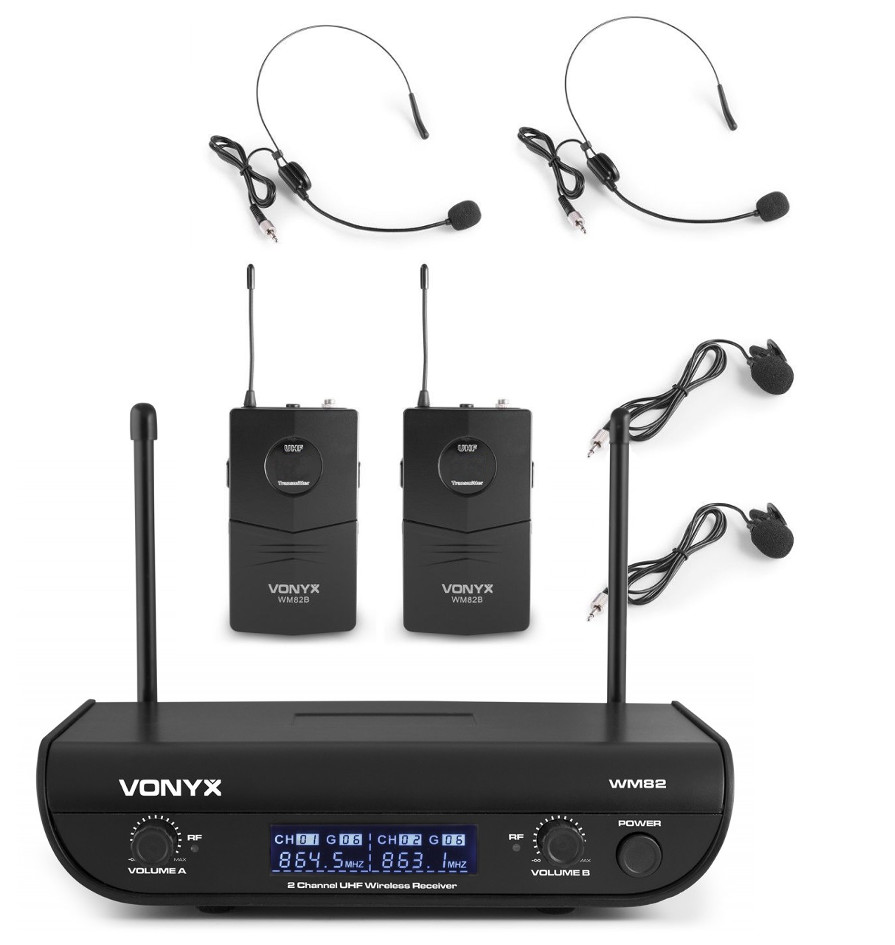 WM82 od marki Vonyx to 2-kanałowy system mikrofonów bezprzewodowych UHF o stałej częstotliwości, w tym dwa bodypacki, dwa mikrofony nagłowne i dwa mikrofony typu tie-clip, krawatowe. W idealnych warunkach można uzyskać zasięg 50 m lub więcej.