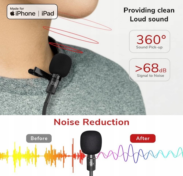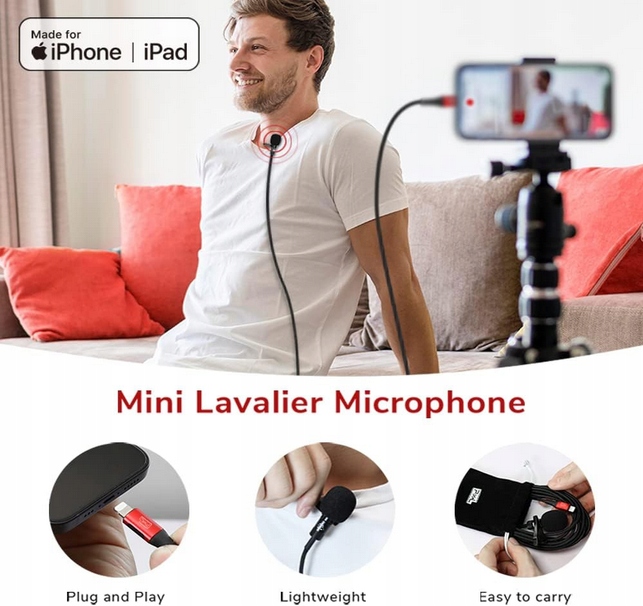 Zgodność z urządzeniami Apple Lightning ----- Mikrofon krawatowy Finch do iPhone'a/iPada jest oznaczony certyfikatem Apple MFi. MFi (Made for iPhone/iPad/iPod) to certyfikat, który Apple przyznaje producentom, aby upoważnić ich do produkcji akcesoriów peryferyjnych do urządzeń Apple. (Uwaga: iPhone 15 jest zgodny z mikrofonami typu C.)