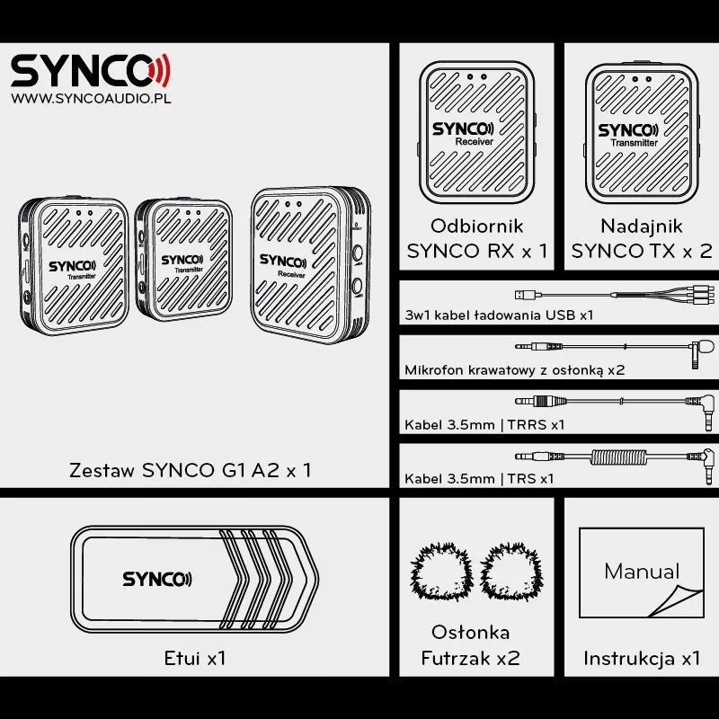 SYNCO G1 A2 to uniwersalny, bezprzewodowy system mikrofonowy pracujący w paśmie 2,4 GHz, który wyróżnia się wyjątkowo małymi gabarytami, wszechstronnością i prostotą użycia.