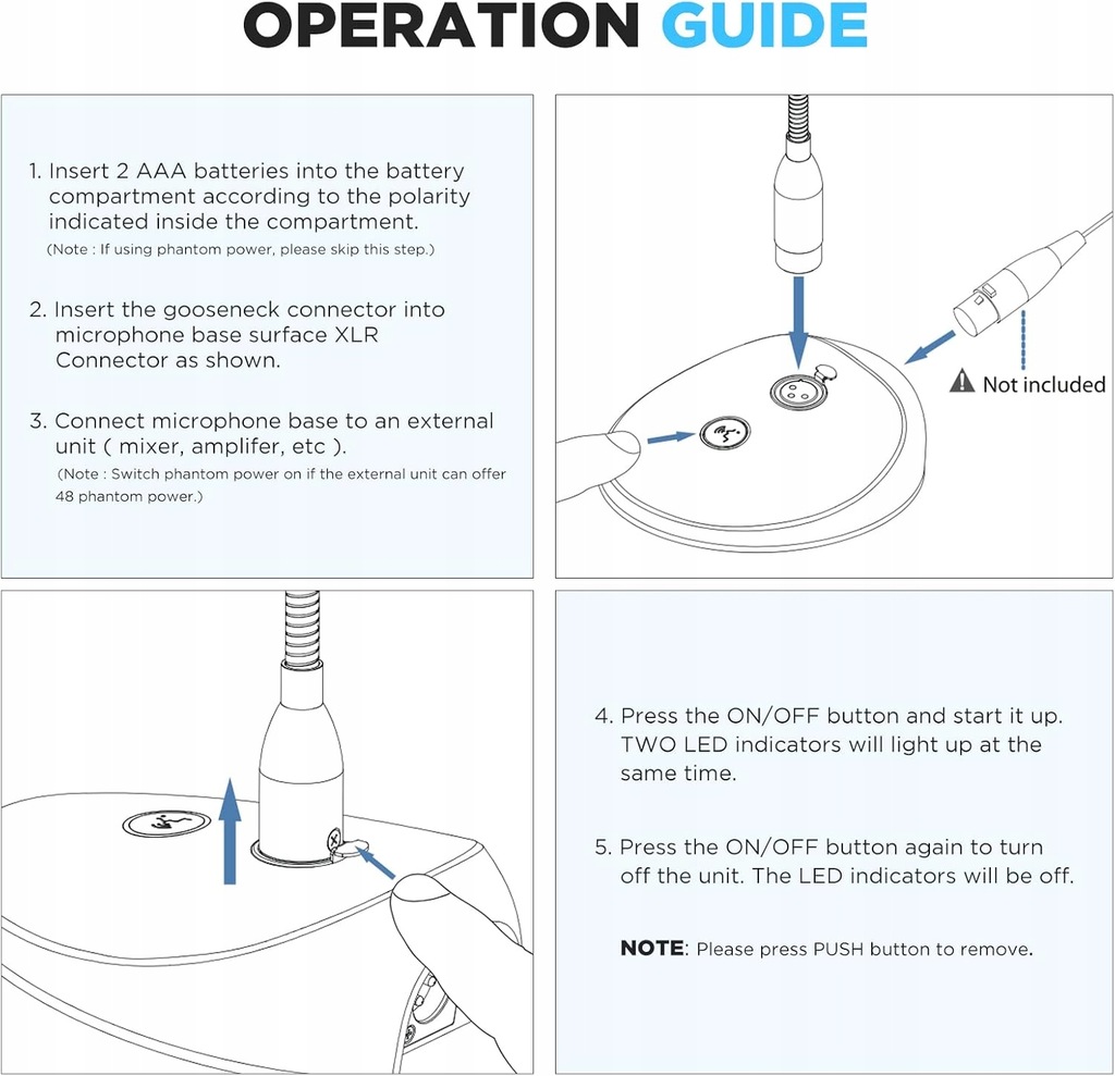 To urządzenie może być zasilane dwoma bateriami AAA lub poprzez 48 V zasilanie fantomowe. Konfiguracja jest niezwykle łatwa – wystarczy podłączyć zasilanie (baterie lub phantom 48 V), a następnie ustawić przycisk na spodzie podstawy w jednym z dostępnych trybów (Push-to-Talk, Always On lub Push-to-Mute), i można rozpocząć pracę.