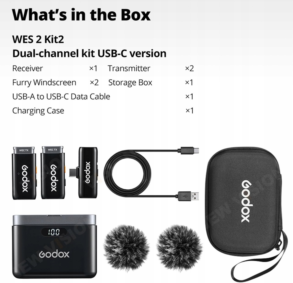Godox WES2 KIT2 bezprzewodowy mikrofon lavalier typu C, MFi Certified, Plug and Play z redukcją szumów z funkcją transmisji na odległość 200 m , etui do ładowania, kompatybilny z type-C, iPhone 15 (WES2 KIT2)