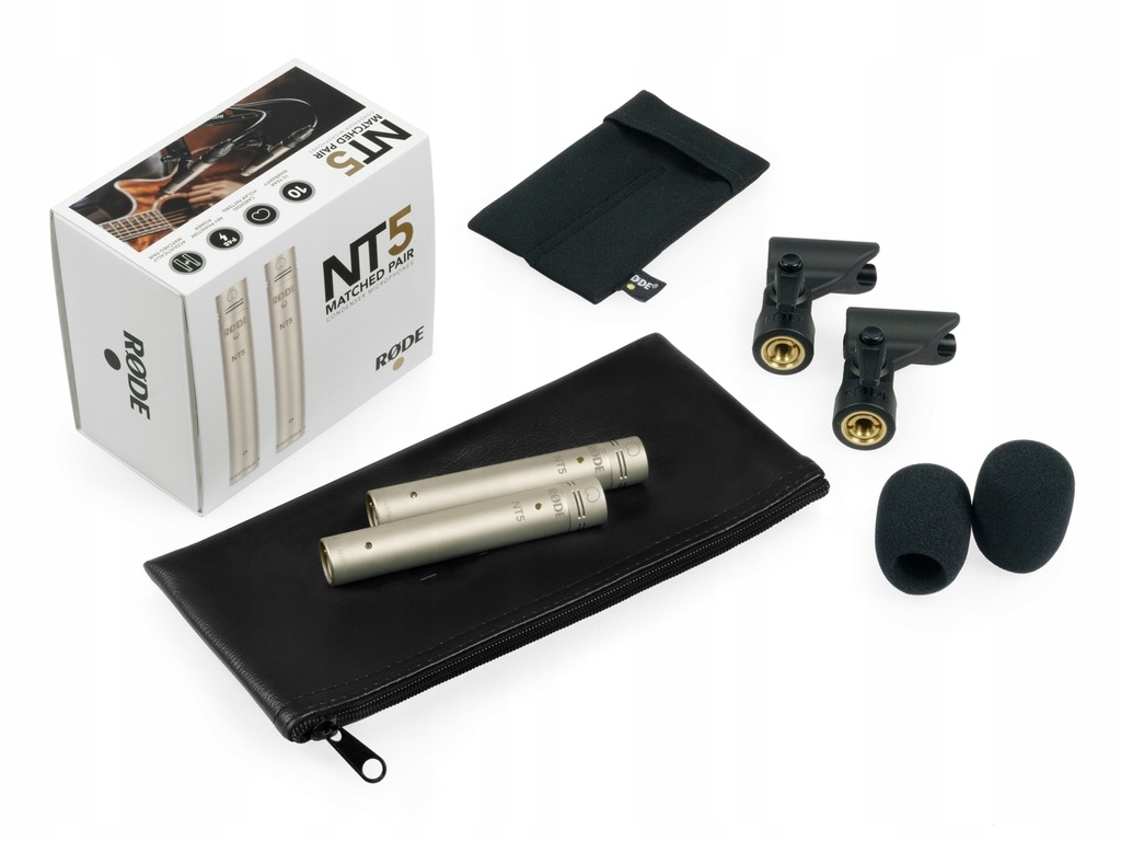 RØDE NT5 Pair RØDE NT5 to zestaw dwóch parowanych 1/2-calowych mikrofonów pojemnościowych o kardioidalnych charakterystykach kierunkowości, które również dostępne są pojedynczo. Zaprojektowano je pod kątem rejestracji instrumentów akustycznych, pracy w charakterze mikrofonów overhead przy nagrywaniu perkusji, instrumentów perkusyjnych oraz do pracy na scenie. Wyposażono je w 1/2-calowe kapsuły polaryzowane zewnętrznie, które połączono z konwerterem impedancji opartym na tranzystorze J-FET oraz bipolarnym buforem wyjściowym. Obudowy mikrofonów, które mogą pracować w parze w konfiguracji X/Y lub pojedynczo, pokryto satynowym niklem. Razem z parą mikrofonów użytkownik otrzymuje osłony przeciwwietrzne i uchwyty.
