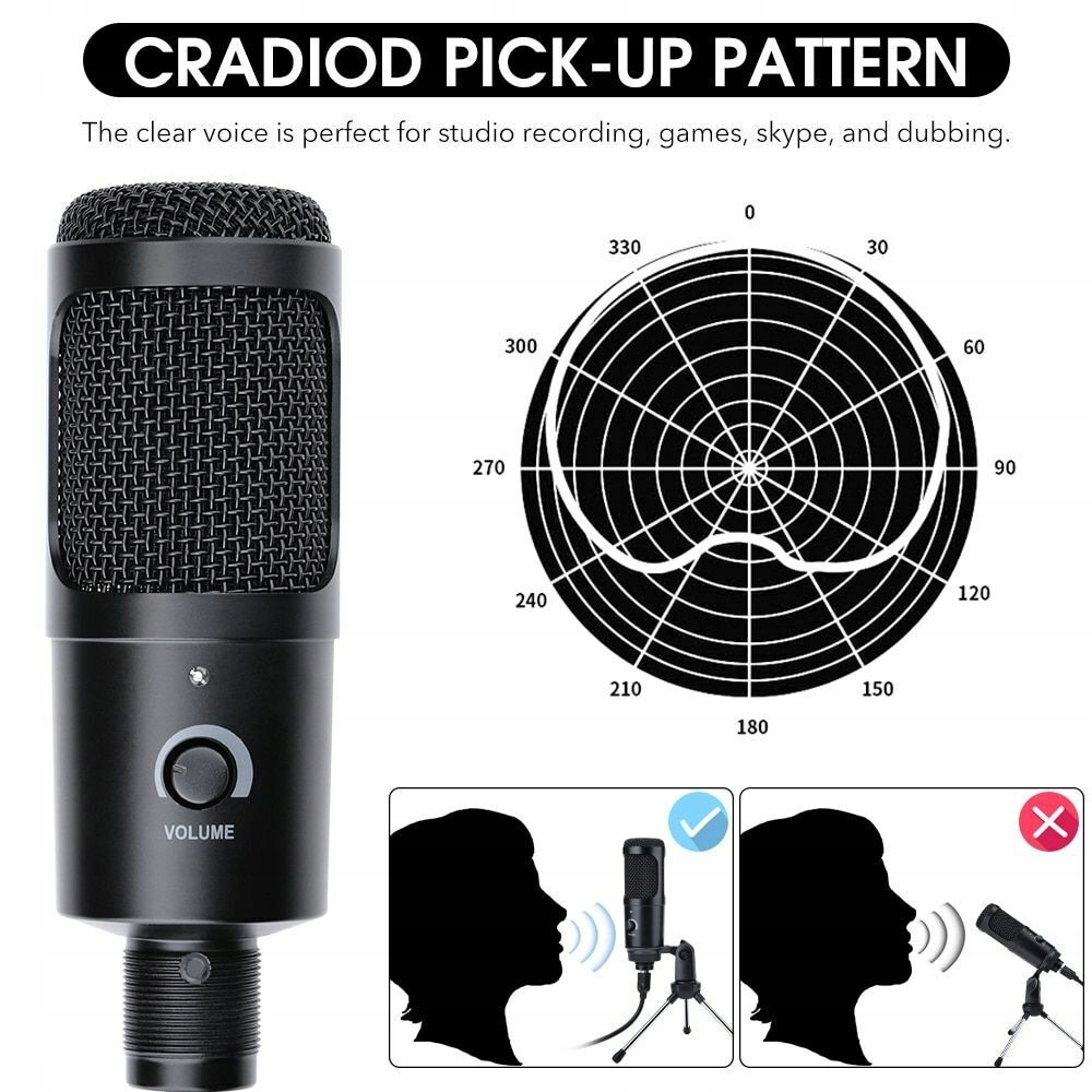 - Mikrofon pojemnościowy o charakterystyce kardioidalnej do komputera prawidłowo rejestruje głos, skutecznie redukuje szumy tła z boku i z tyłu oraz poprawia klarowność dźwięku.