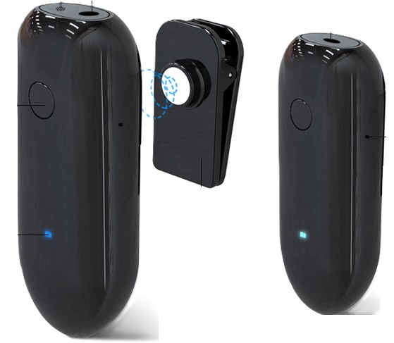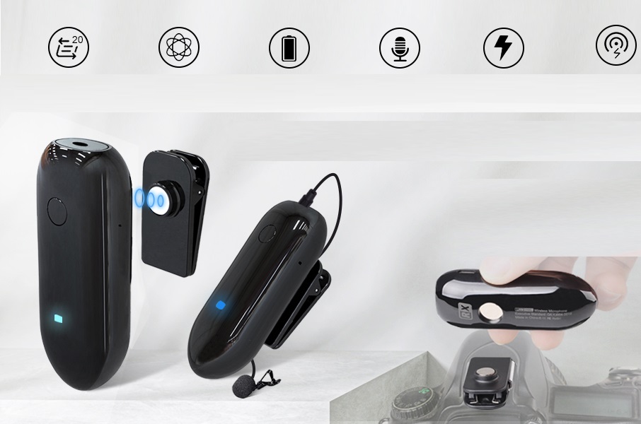 Mikrofon posiada specjalny klips, który pozwala na zamocowanie go niemal wszędzie, np. do kołnierzyka koszuli lub marynarki.