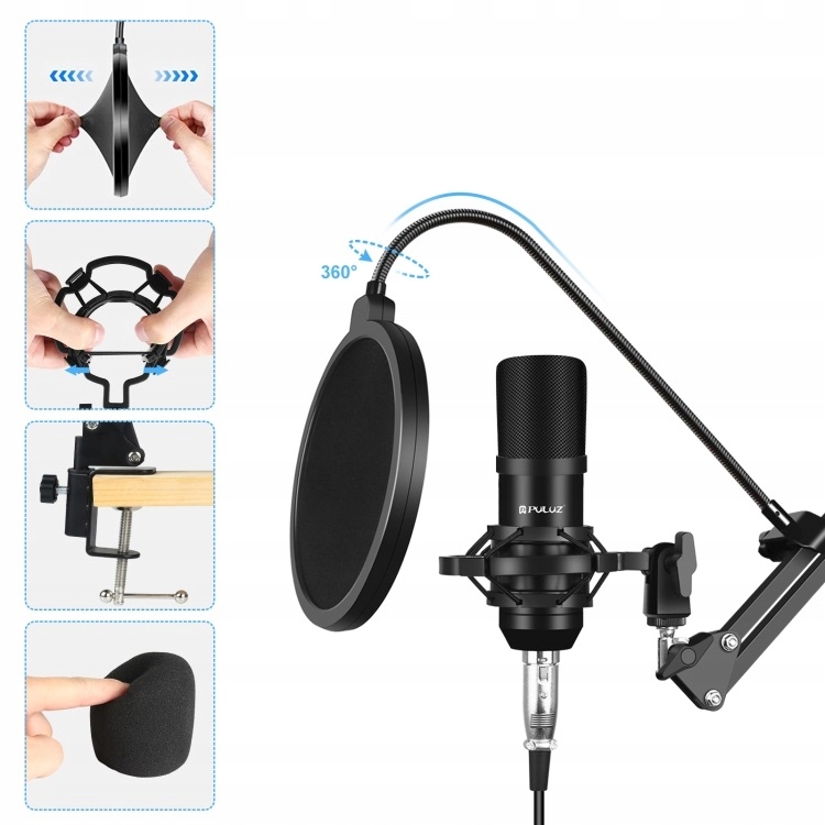 Dostosuj położenie mikrofonu do własnych potrzeb. W zestawie znajdziesz statyw, który z łatwością przymocujesz do wybranej powierzchni o grubości do 15 cm. Możesz dostosować jego kąt w zakresie 360°. Ponadto regulacji podlega również filtr pop (360°) oraz mocowanie mikrofonu (270°). Ciesz się swobodą użytkowania z Puluz PU612B Studio Broadcast.